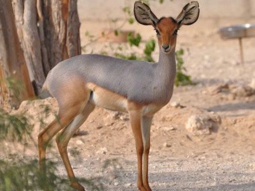 Description: The Beira antelope is a slender, arid-adapted and elusive dwarf antelope. It has a light browny-grey coat, white underbelly, oversized ears, and short, sharp, vertically straight horns.