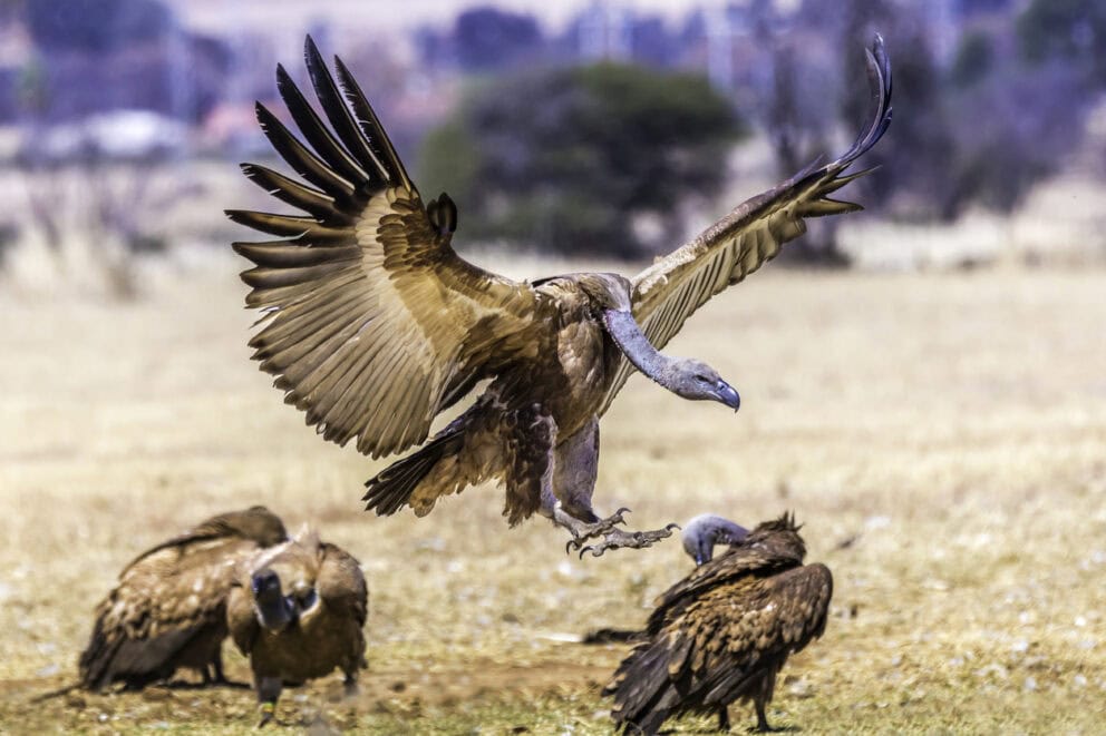 The Cape griffon vulture is a vulnerable Old World vulture that is endemic to parts of South Africa, Lesotho, Botswana, and northern Namibia. They are large raptors, with a wingspan that exceeds 2.5 metres. They lay only one egg per year, and are characterised by pale-coloured underparts, dark tail and flight feathers, and an almost bare head and neck.