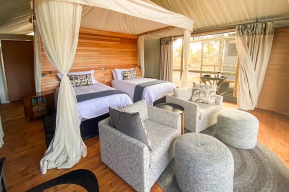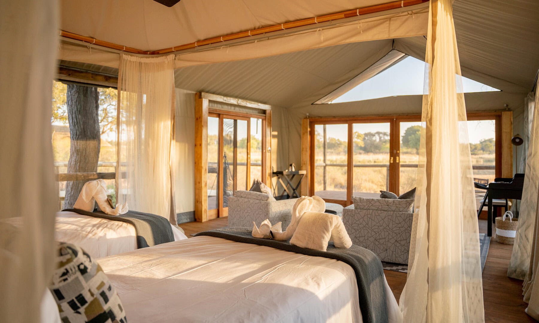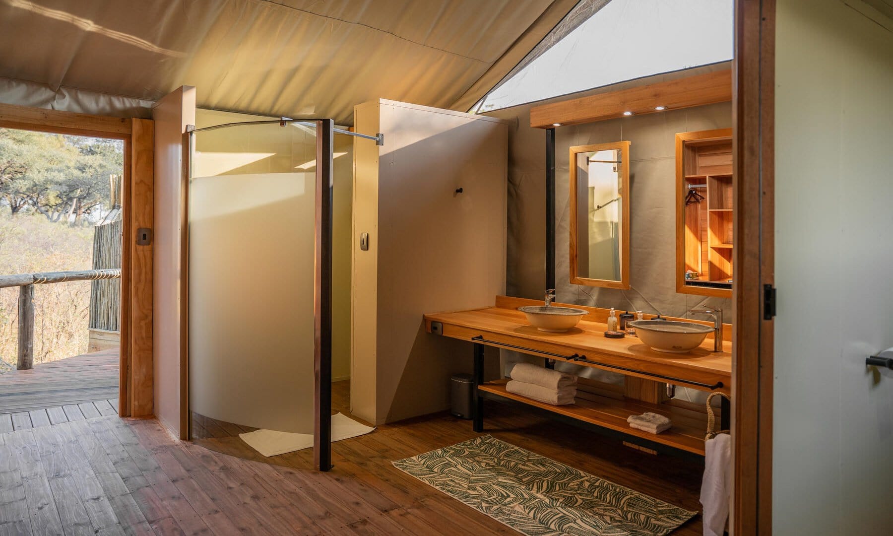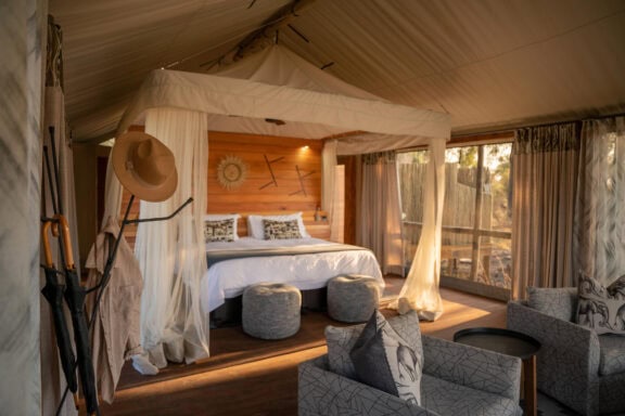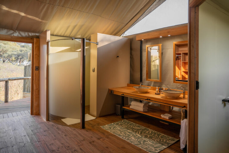 Designed for a classic bush experience, the camp has nine large spacious en-suite tents (including a family tent) featuring a pretty patio, lounge area, plus indoor and outdoor showers.