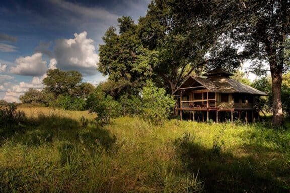 The intimate, tented retreat is located amid the shimmering grasslands of the Khwai Private Reserve,...