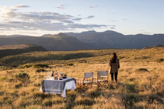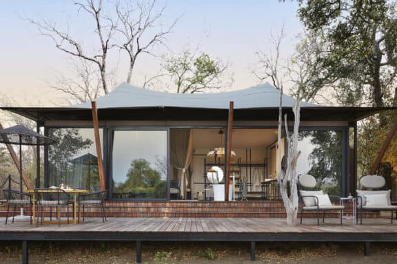 Located under a Morukuru tree along the Marico River in South Africa’s Madikwe Game Reserve,...
