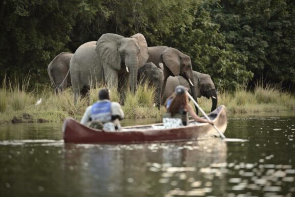 Flanked by a grove of towering ebony trees on one side and the Luangwa River...