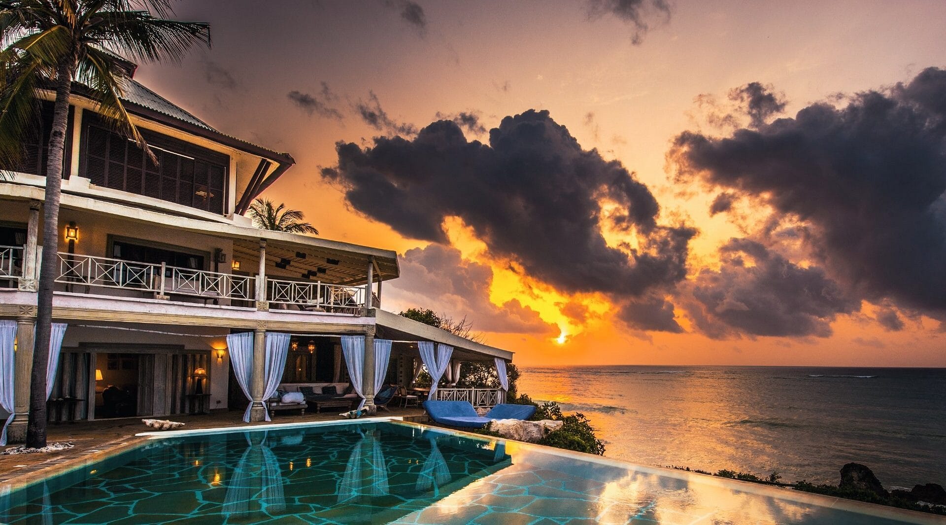 Large verandas with substantial hand-carved sofas with cushions dominate the front of the estates, where a stretch swimming pool sits on the edge of a small cliff merging into the sea and the horizon.