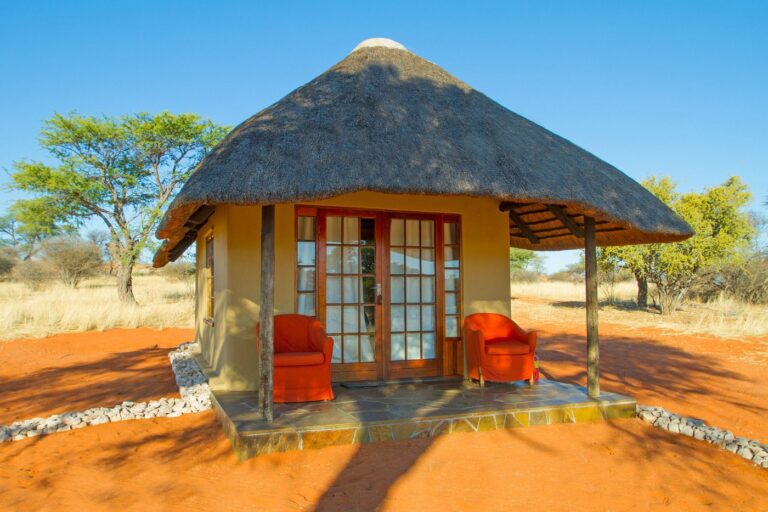 A backdrop of red dune sands, yellow grasses, piercing blue skies, and the greens and browns of the widely spaced Camelthorn and Acacia trees frames the 12 rondavel-style thatched houses.