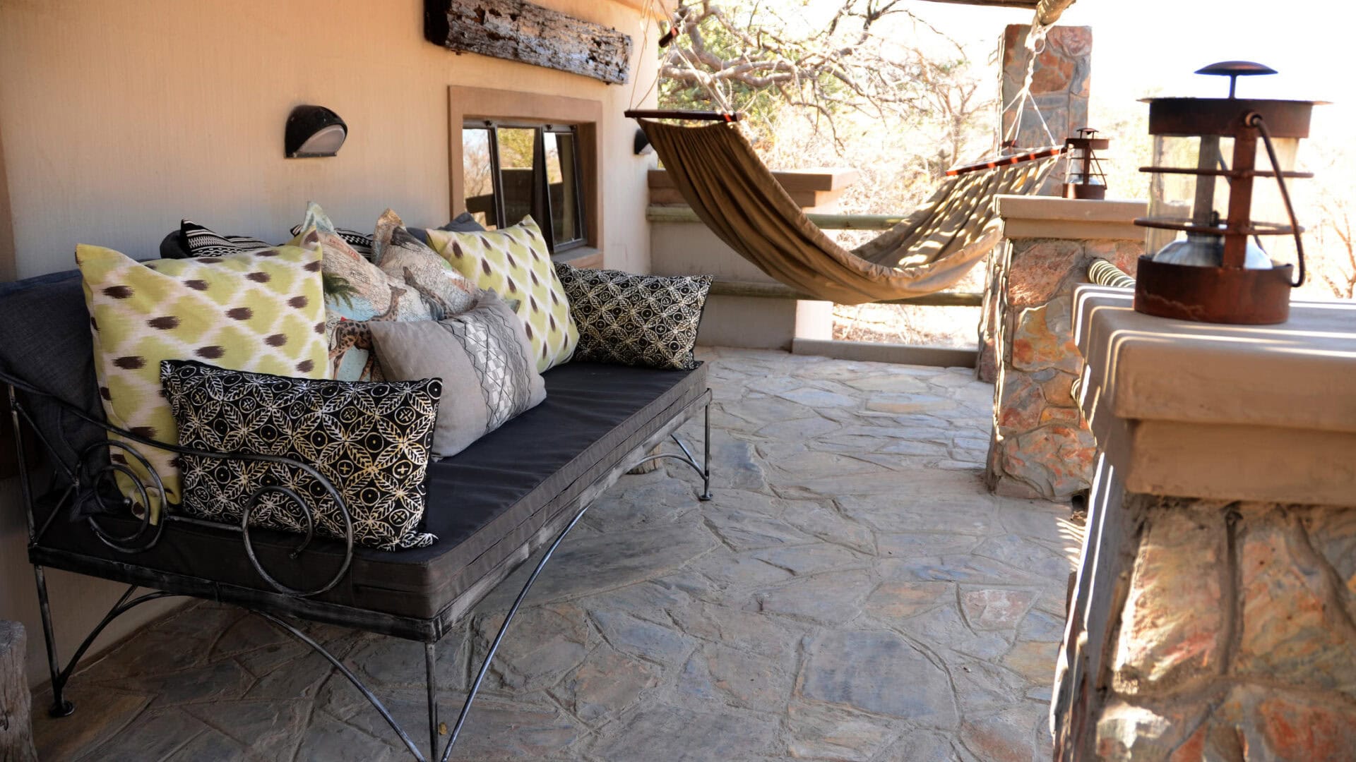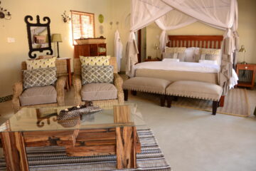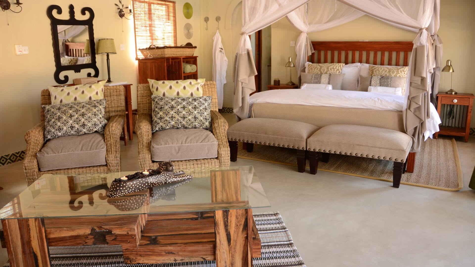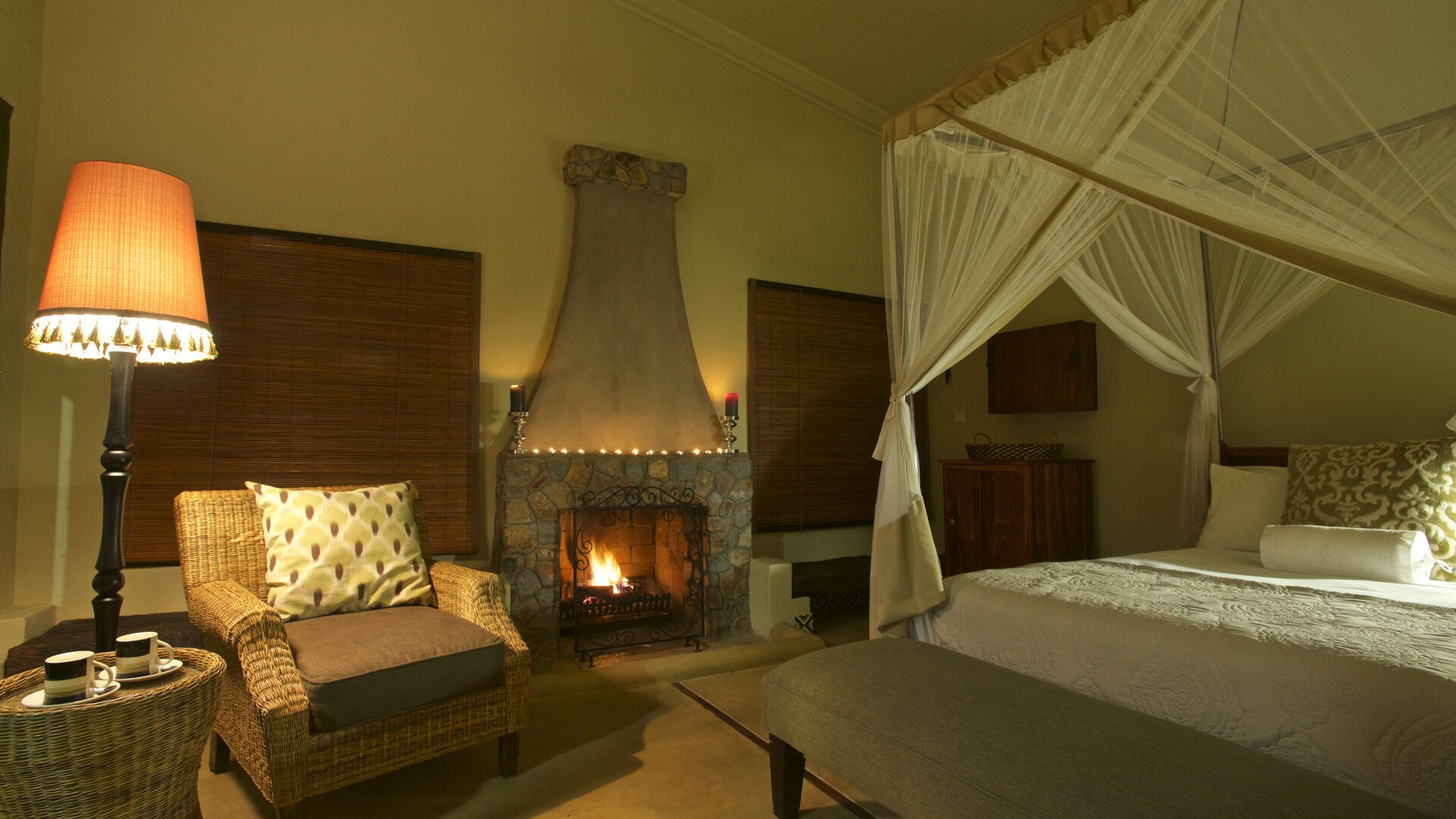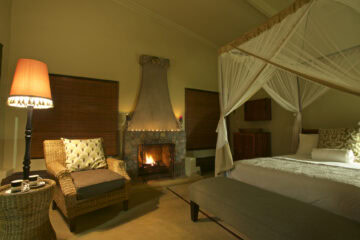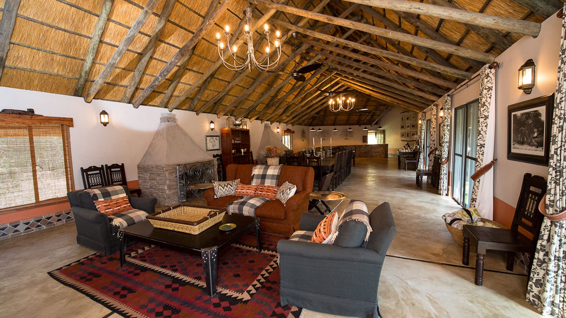 The main lodge is an impressive thatched structure, with its western wing containing a formal dining room with three fireplaces for chilly evenings, while the eastern wing provides an open-fronted bar and lounge area.
