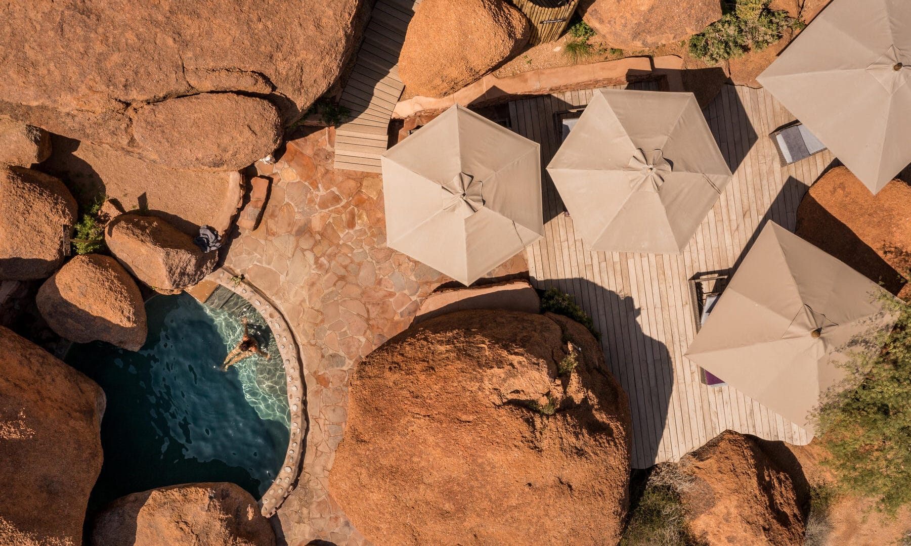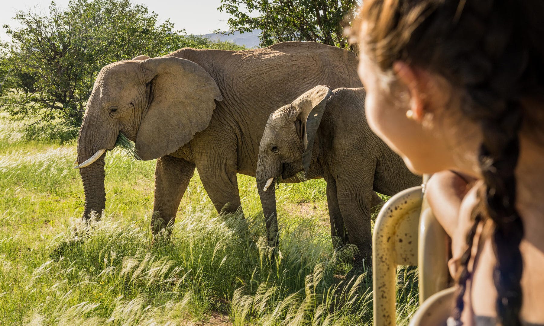 The camp organizes various activities, including guided nature walks in the Twyfelfontein Conservancy and tours to see the Bushman etchings, Organ Pipes, and Burnt Mountain. A highlight is the Elephant Nature Drive which offers a chance to spot rare desert-adapted elephants in the arid northern Namibian landscape.