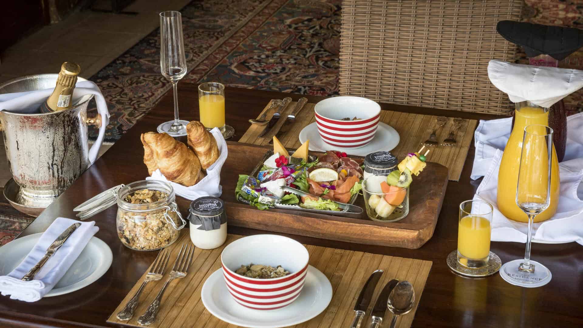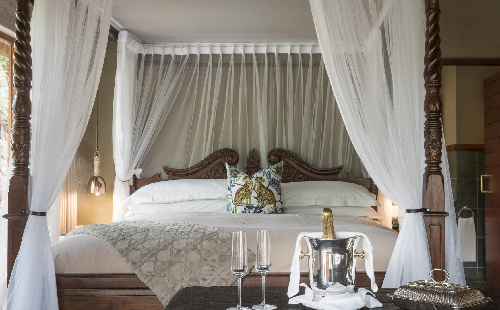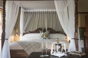 Huge four poster beds dominate the main bedrooms of the suites, flowing into sizable bathrooms with separate bath, indoor and outdoor showers, and private lounges overlooking the plunge pools and open plan outdoor private lounges.