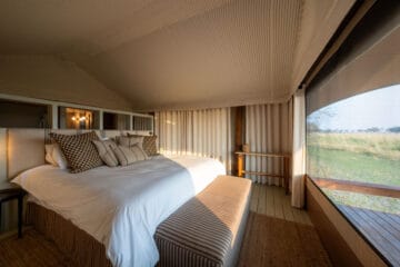 Cha Cha Metsi camp consists of six en-suite tents elevated on wooden platforms. Each features a private veranda, providing a quiet space to soak in the views of the Delta’s winding waterways.