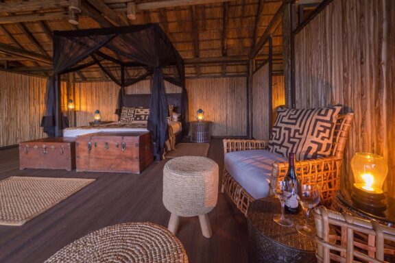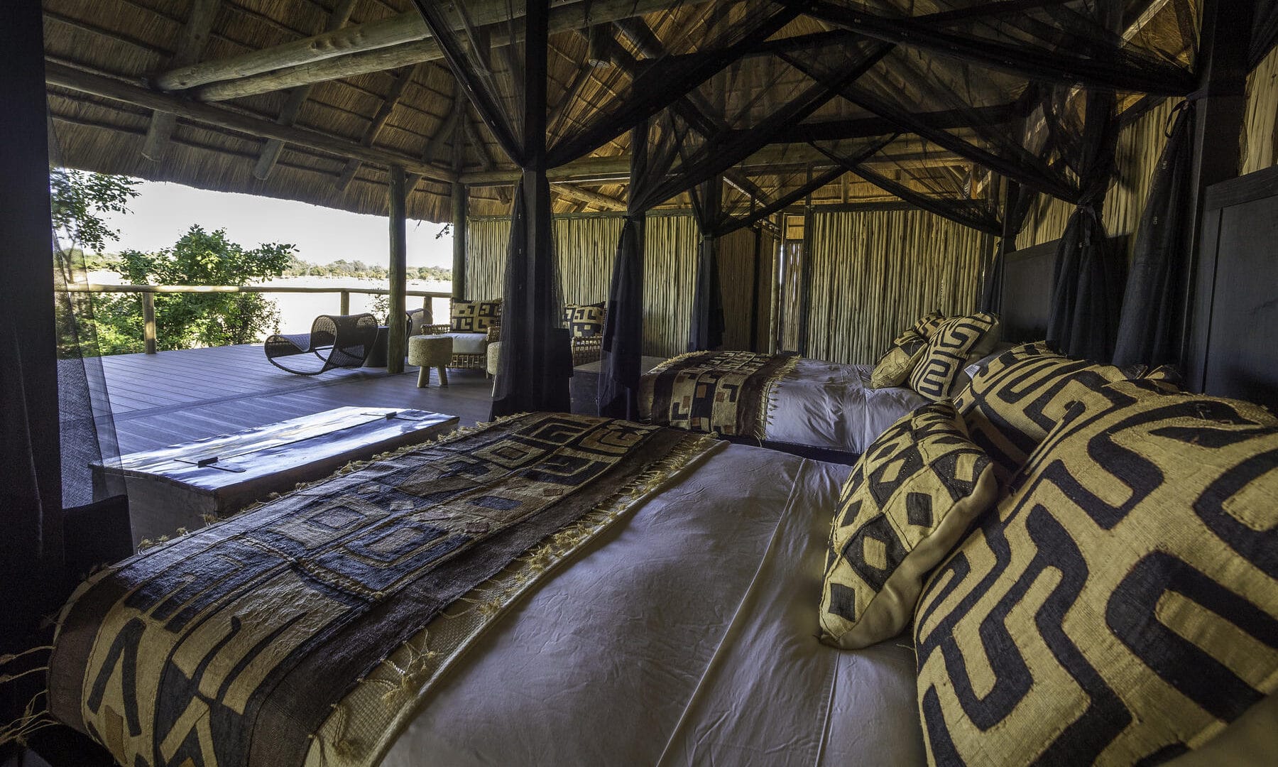 There are only three rooms, each with a raised verandah to loll on in the heat of the day and magnificent views of the tranquil river. At the thatched bar and dining area, enjoy a sundowner as you watch the wildlife do the same at the river and the monkeys swing above your head.
