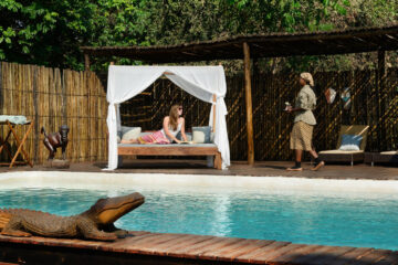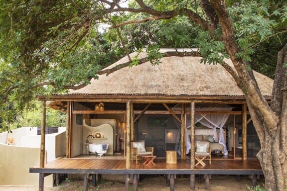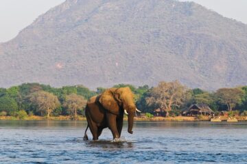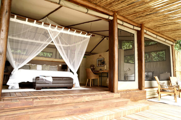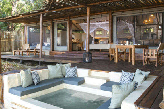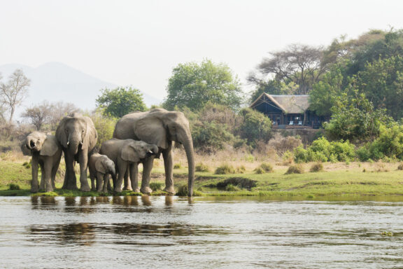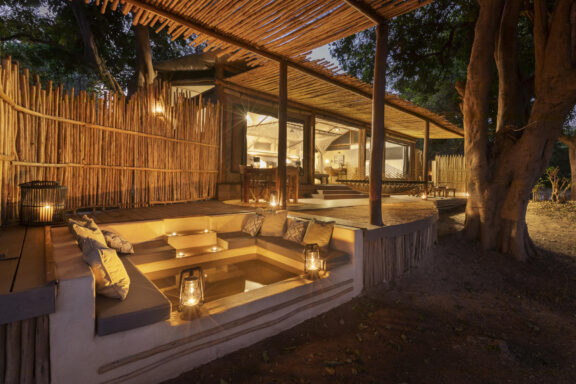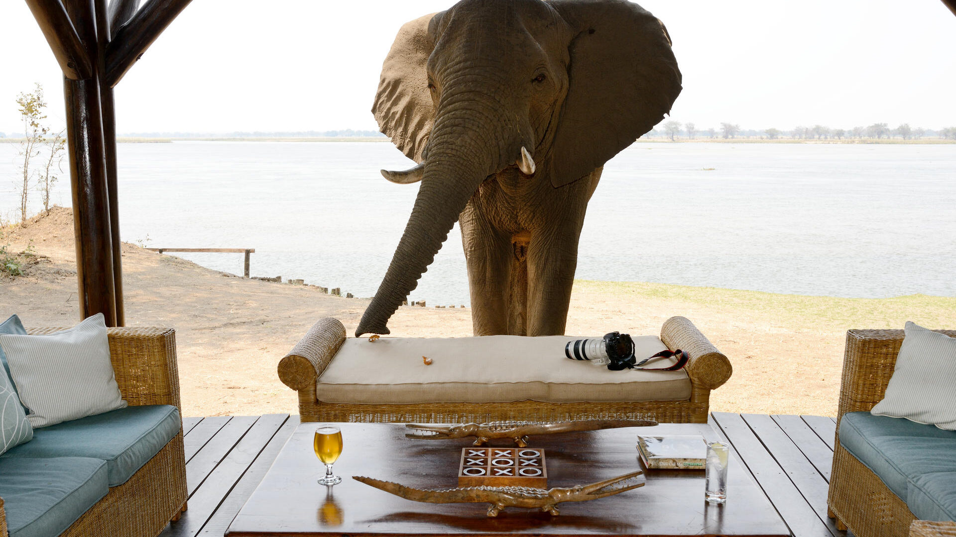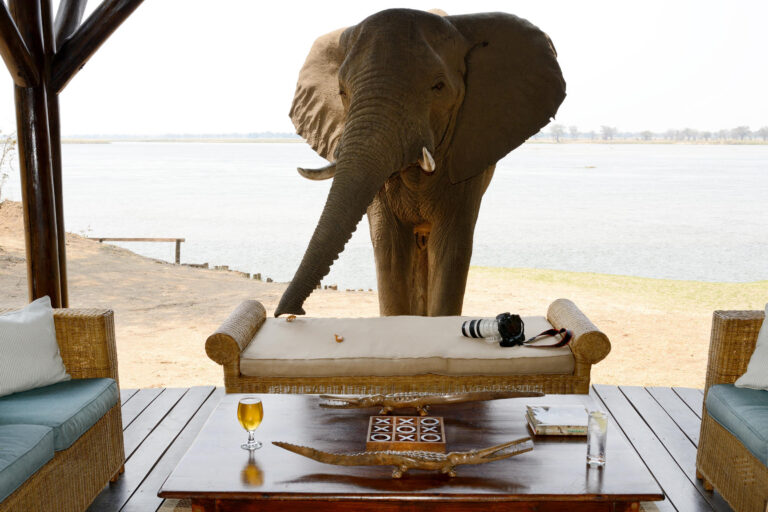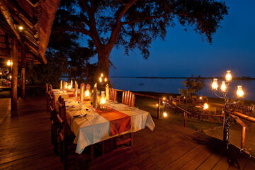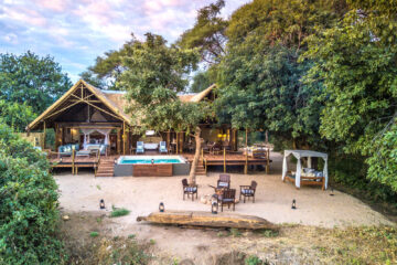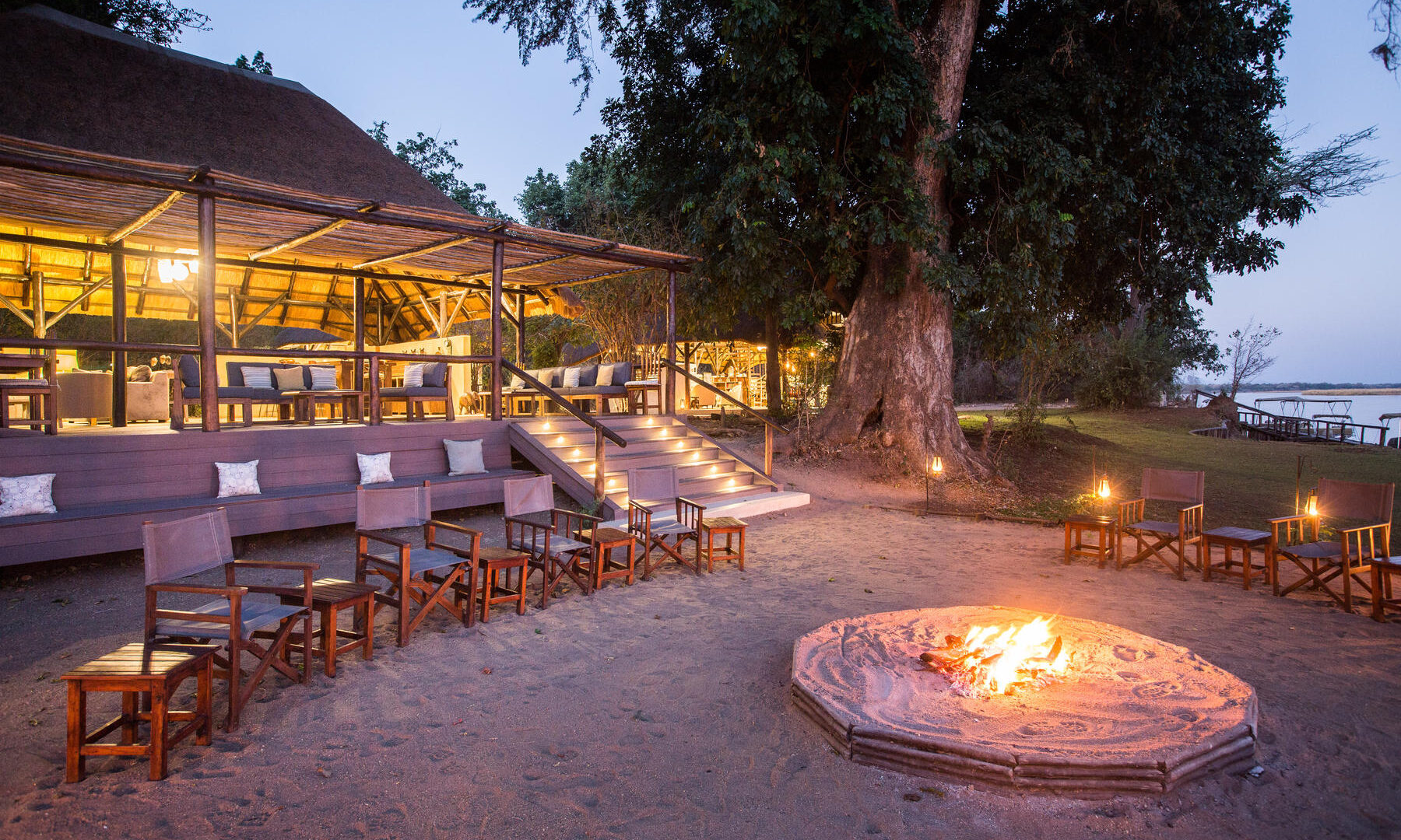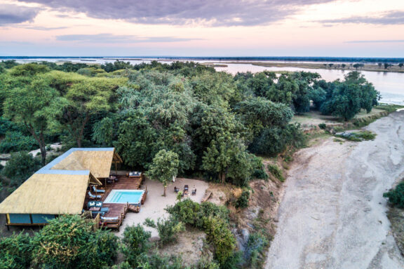 On the banks of the Zambezi River, under the largest grove of Mahogany trees, the multi-award winning “Best in Africa” Chiawa Camp holds the prime position in the heart of Zambia’s Lower Zambezi National Park. A stunning thatched lounge/bar area with an upstairs viewing deck provides one of the best views of the Zambezi.