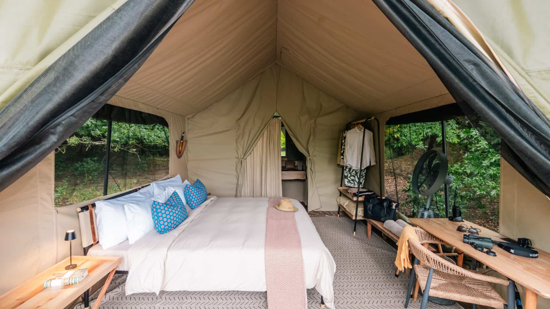 Chicari Camp is a seasonal, low-environmental-impact safari camp set beside a year-round pan in Gorongosa National Park. Surrounded by fever trees and woodland, this newly built camp offers a contemporary experience in one of Africa’s most dynamic ecosystems. With just ten canvas tents, including two unique Treehide Tents, Chicari remains intimate and well integrated into its natural surroundings.