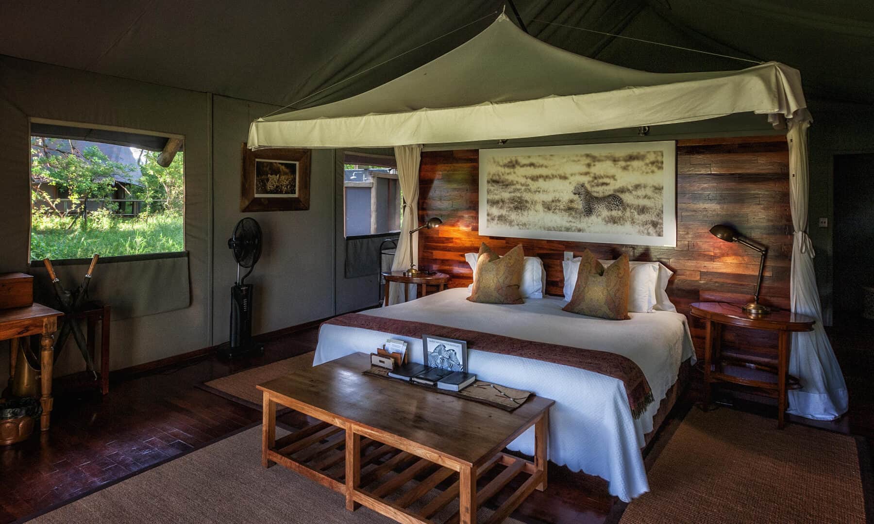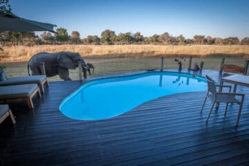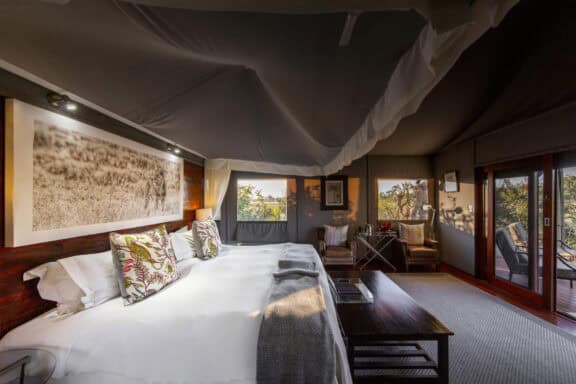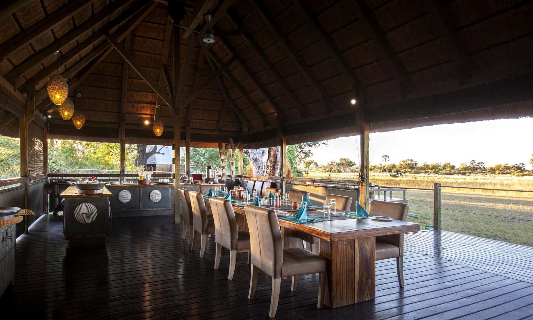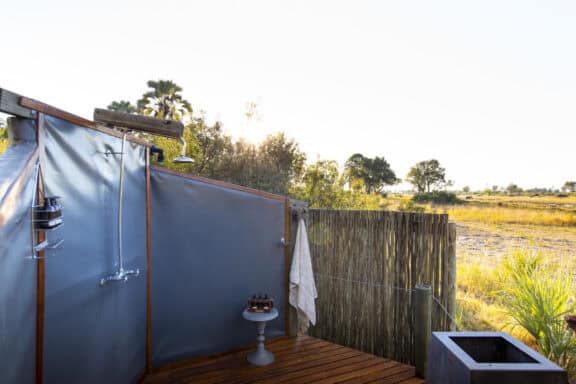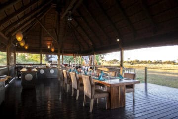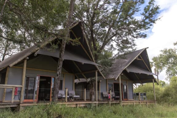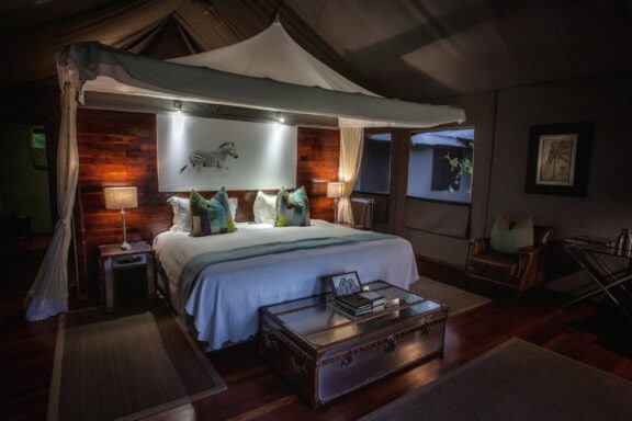 Of the five meru-style guest tents, each decorated in a distinctive and appealing style, two are specifically designed for families having adjoining bedrooms and a shared en-suite bathroom. The dining area, lounge and pool have a glorious vantage over the small lediba (a lagoon within a channel) after which the camp is named and lend themselves to recounting exciting safari tales.