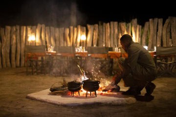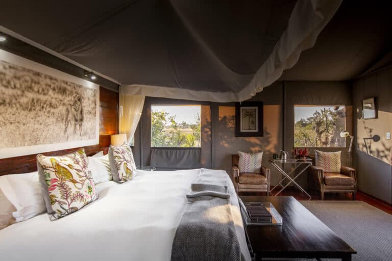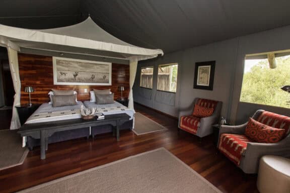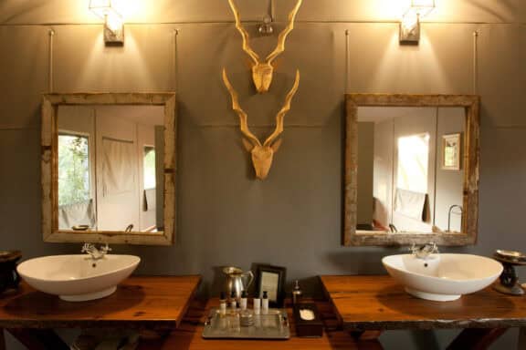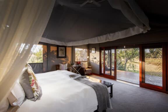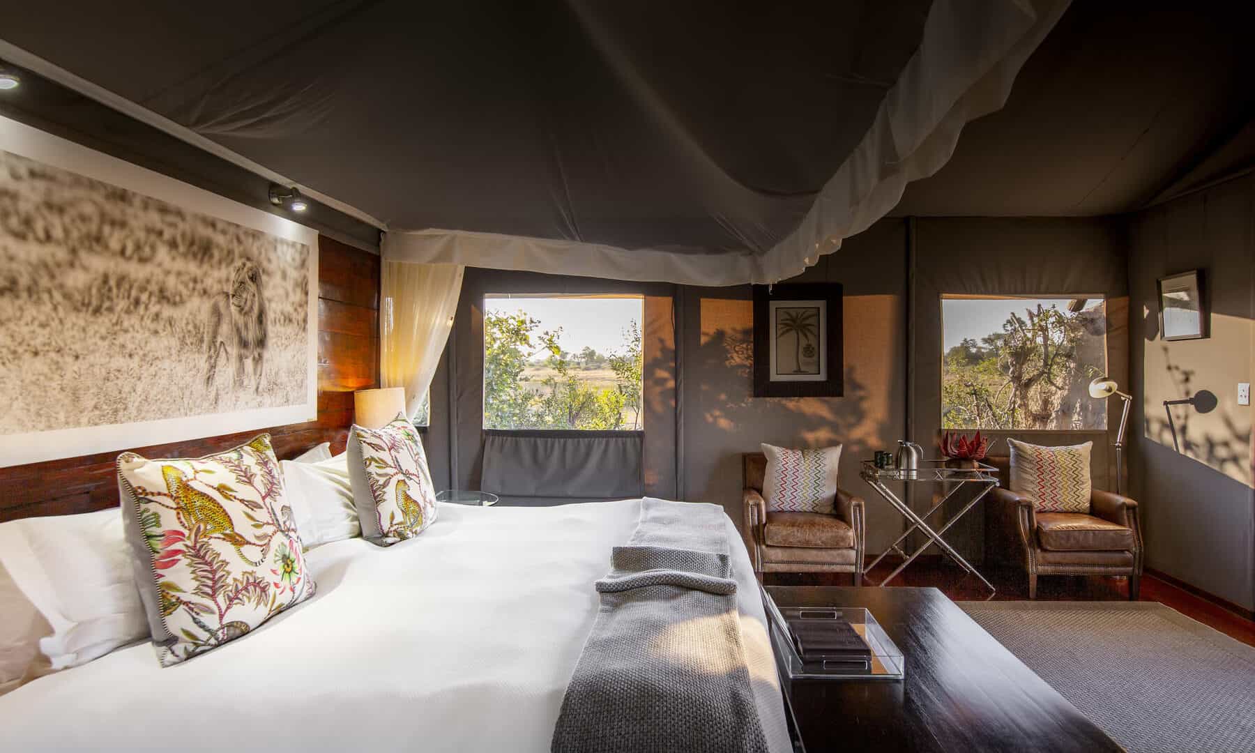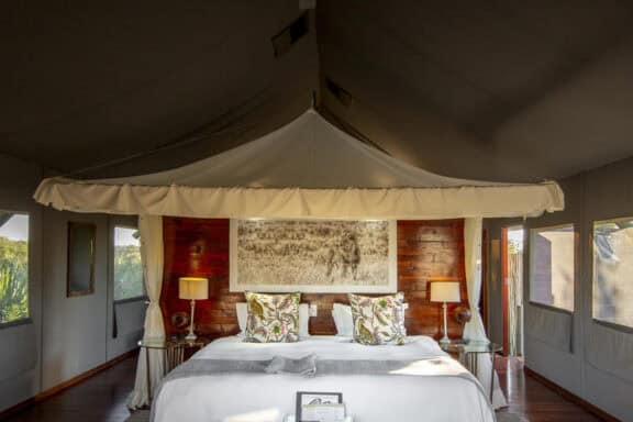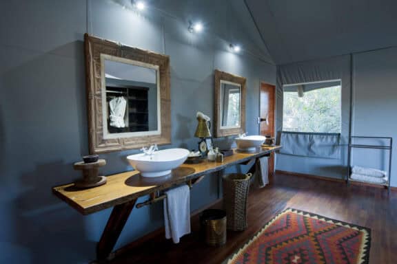 Of the five meru-style guest tents, each decorated in a distinctive and appealing style, two are specifically designed for families having adjoining bedrooms and a shared en-suite bathroom. The dining area, lounge and pool have a glorious vantage over the small lediba (a lagoon within a channel) after which the camp is named and lend themselves to recounting exciting safari tales.