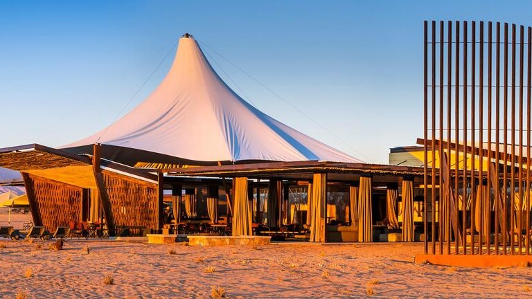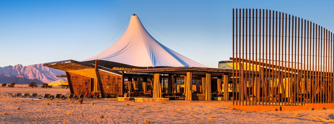 Dead Valley Lodge is situated inside the Namib-Naukluft Park, between Seriem and Elim Dune and near the Dead Valley at Sossusvlei, Namibia. The lodge offers luxury tented chalets with panoramic views of the Namib Desert’s towering red sand dunes and mountain ranges.