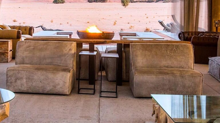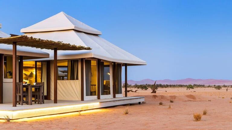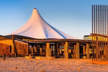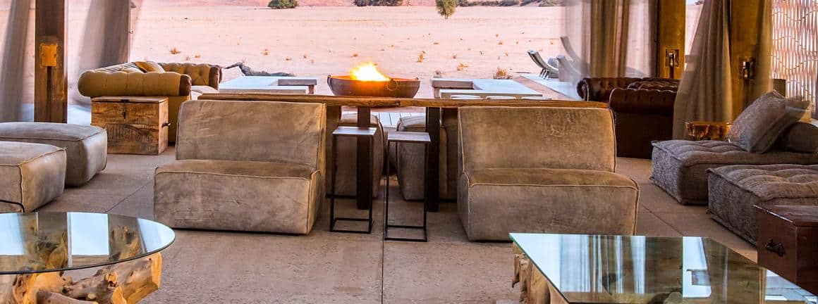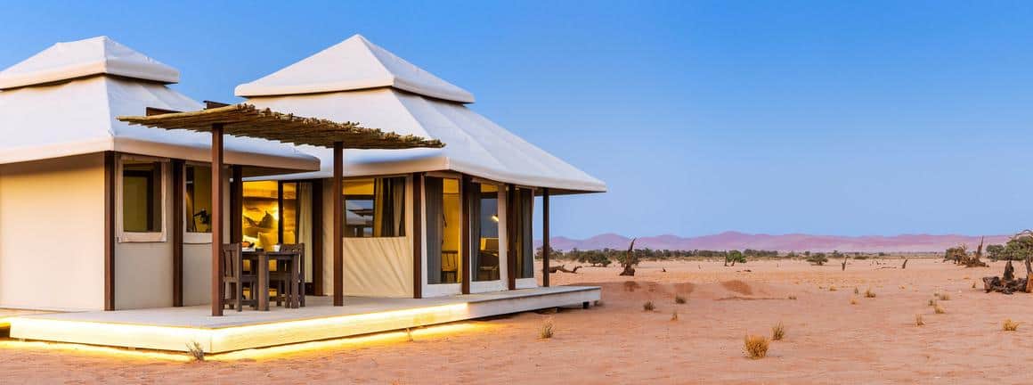 Dead Valley Lodge is situated inside the Namib-Naukluft Park, between Seriem and Elim Dune and near the Dead Valley at Sossusvlei, Namibia. The lodge offers luxury tented chalets with panoramic views of the Namib Desert’s towering red sand dunes and mountain ranges.