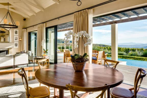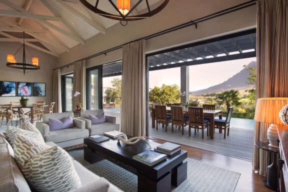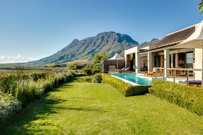Not forgetting the superb owner’s villa with its 4 bedrooms. Laurence Graff’s private retreat, is a two-level, 660 m² architectural masterpiece offering a 14 m heated infinity pool, expansive outdoor living and dining areas, and views over Stellenbosch Valley towards Table Mountain.