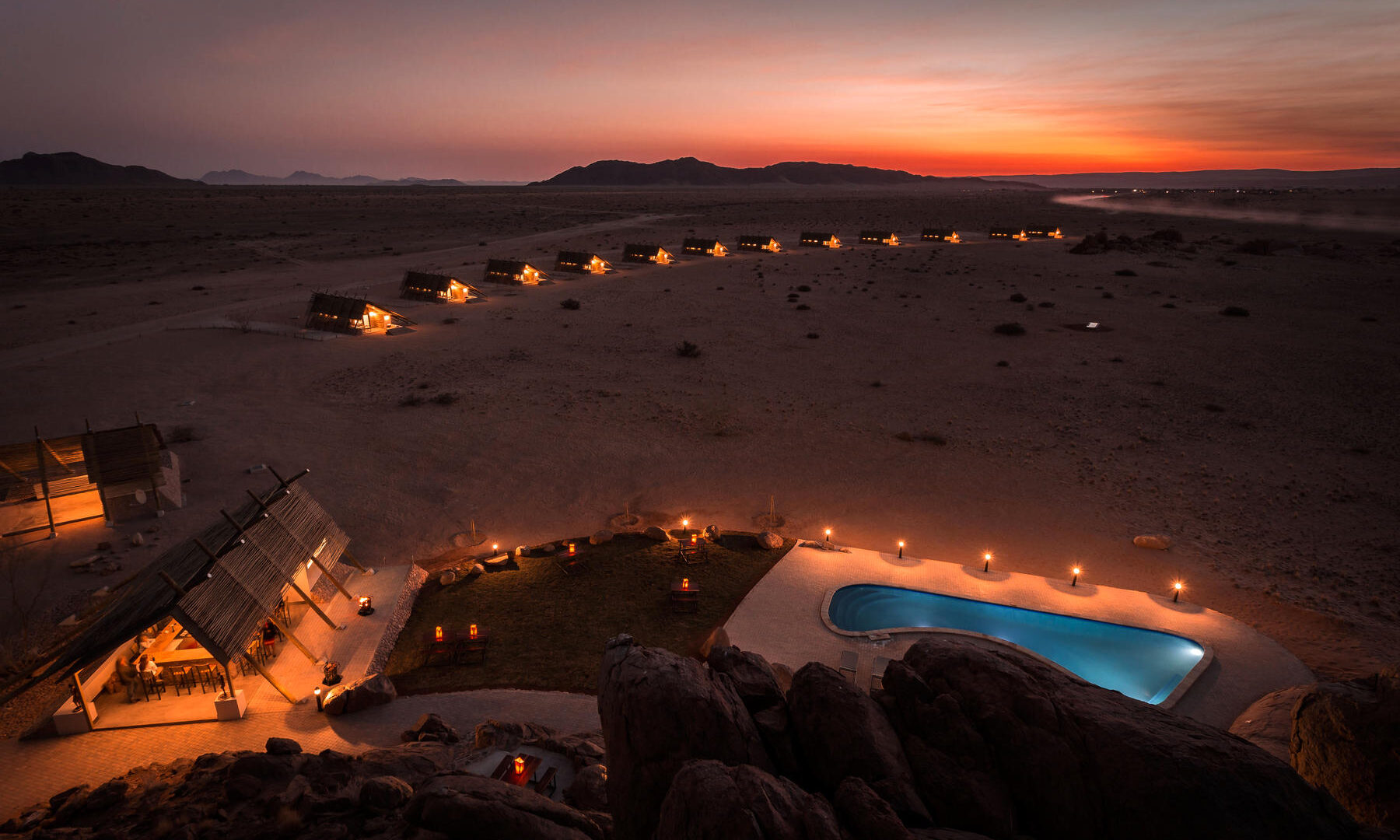 Desert Quiver Camp uniquely combines modern self-catering accommodation with comfort and style. Conveniently located a mere 5km from the entrance gate to Sossusvlei, the inspiring scenery characterised by granite outcrops, spectacular views and roaming wildlife will captivate your senses.
