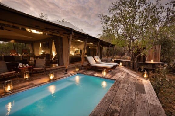 Duba Plains Camp has 5 bespoke suites and a 2-bedroom Duba Plains Suite. The camp sits on raised decking, with views of the surrounding floodplain, designed by Dereck Joubert to fit into the landscape and evoke the classic African safari style of the 1920s.