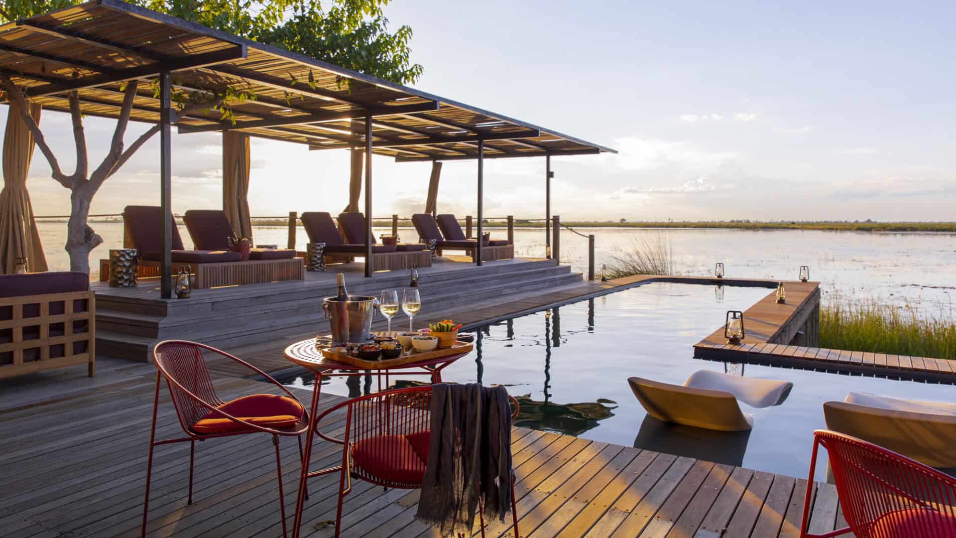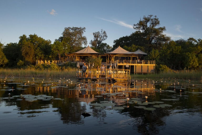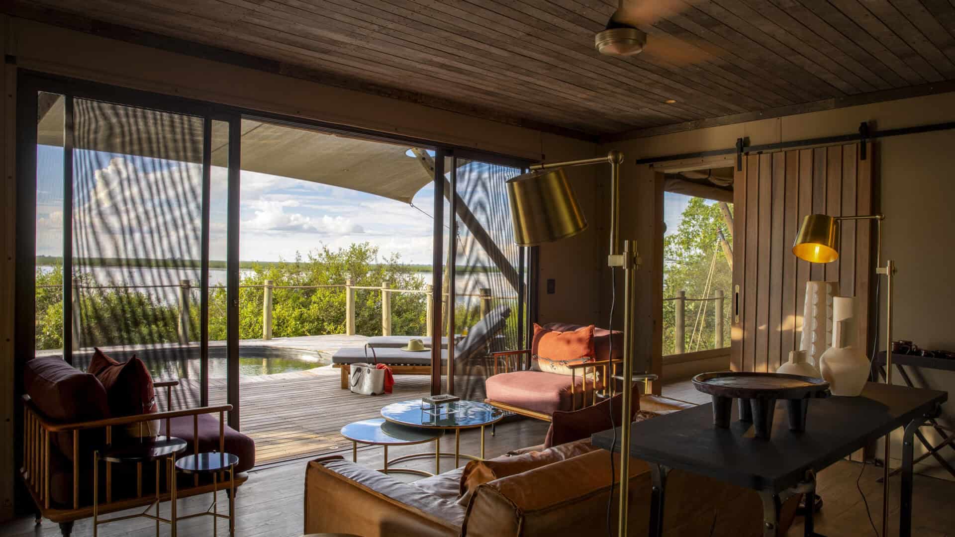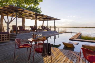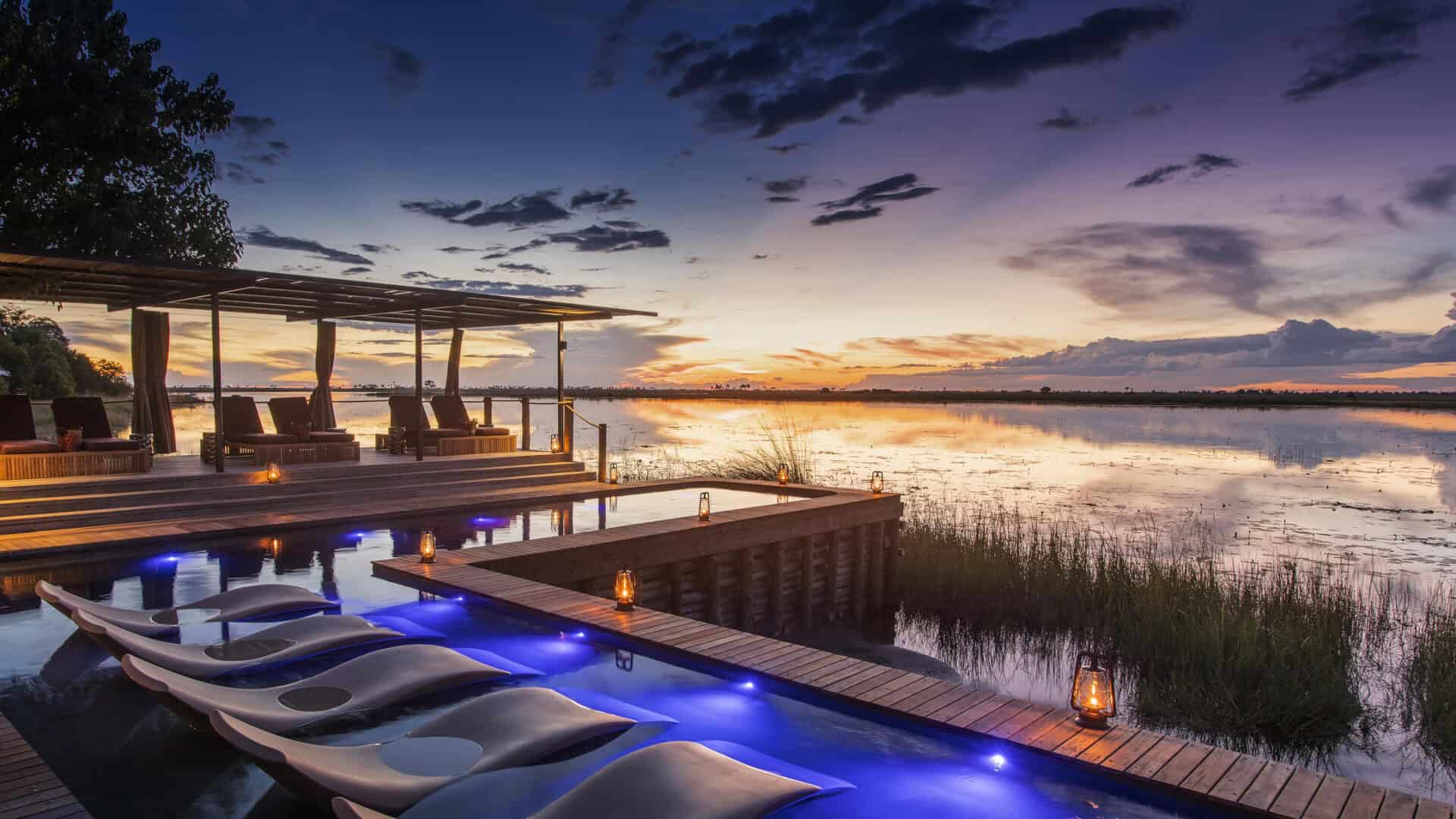 The main area features a floating fire deck for evenings under the stars, while the shared Osprey Retreat provides a sanctuary for wellness with its spa, gym, snack deli, and lap pool. As one of the most sustainable Botswana camps, the property runs entirely on solar energy, blending high-end comfort with a light environmental footprint.