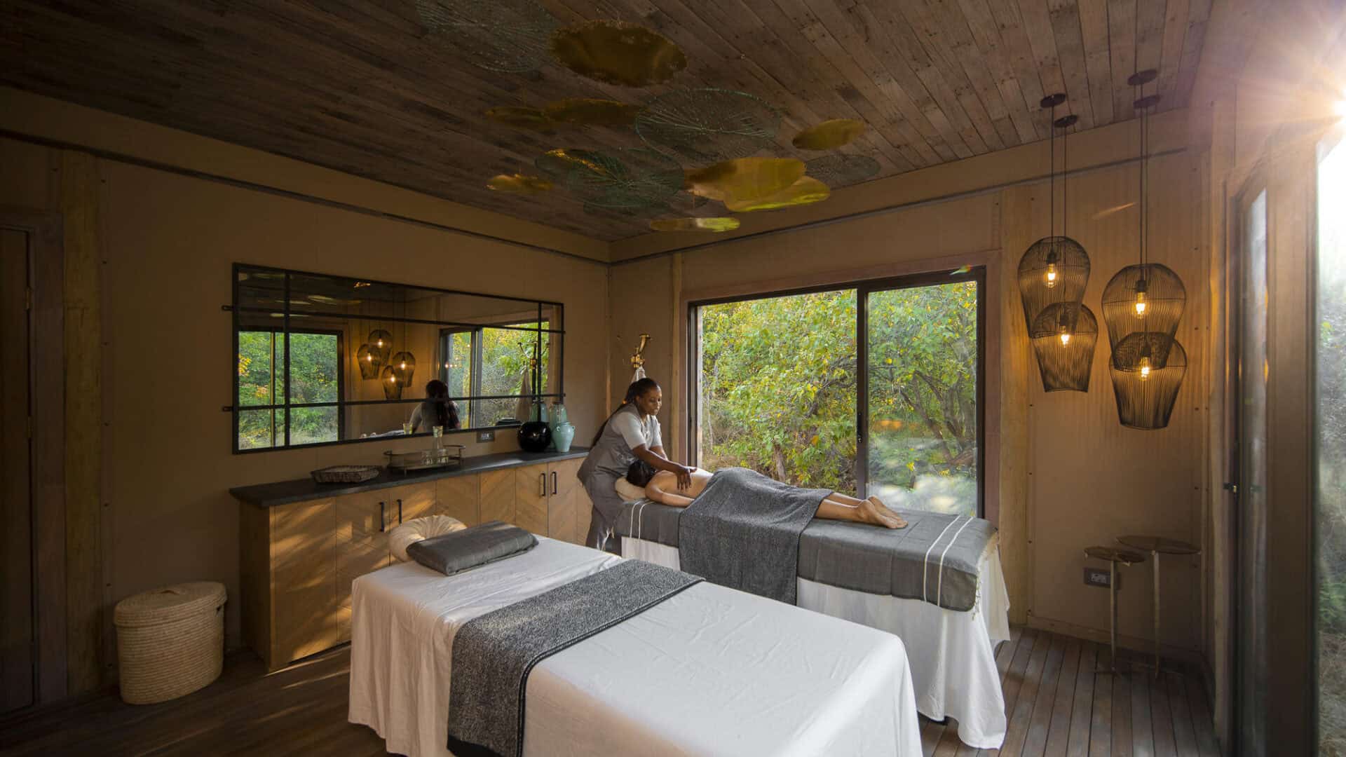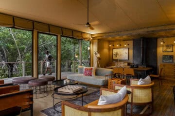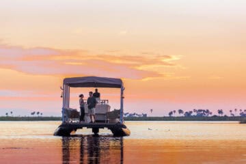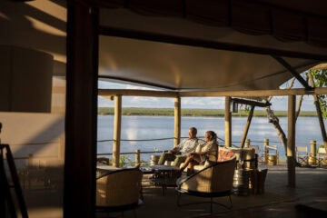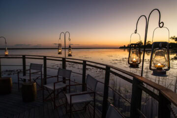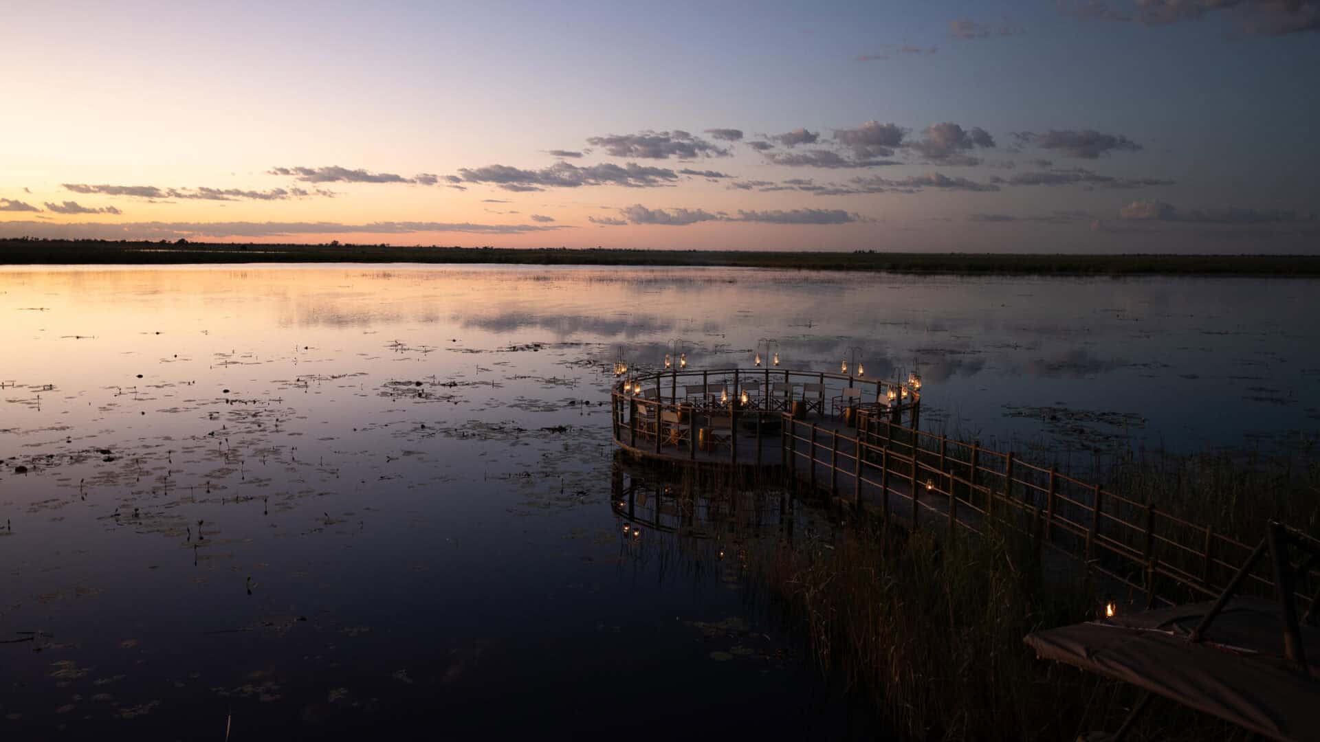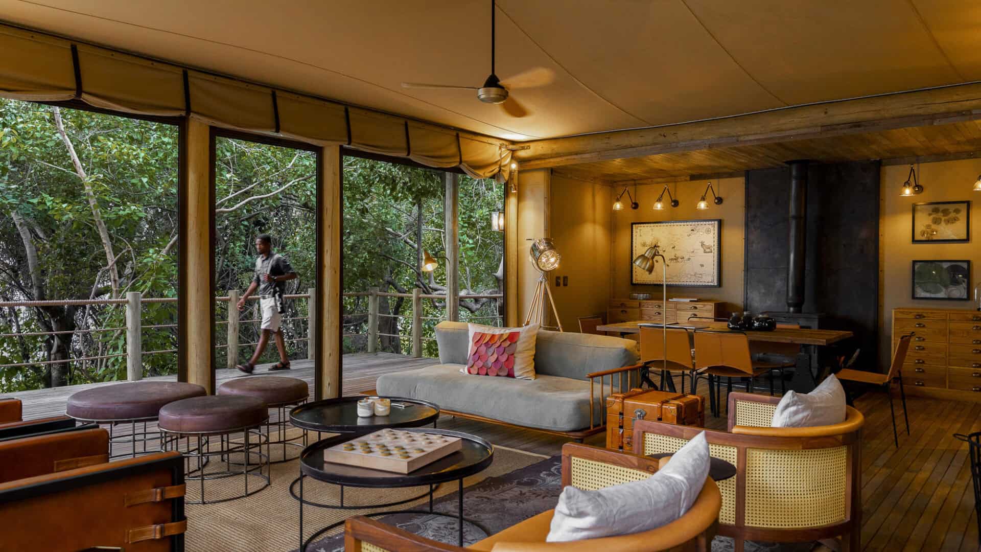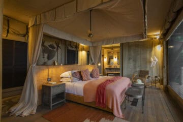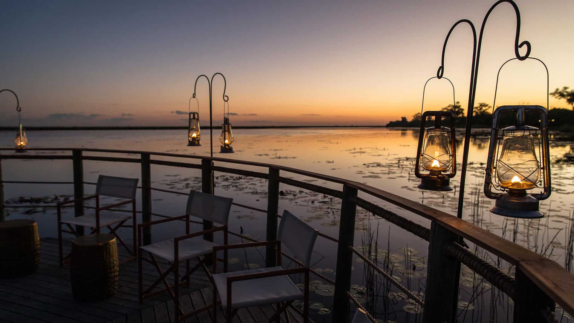 The main area features a floating fire deck for evenings under the stars, while the shared Osprey Retreat provides a sanctuary for wellness with its spa, gym, snack deli, and lap pool. As one of the most sustainable Botswana camps, the property runs entirely on solar energy, blending high-end comfort with a light environmental footprint.