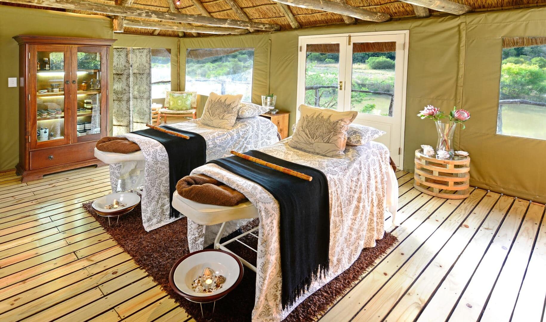 You can relax in your private suite complete with a heated plunge pool or unwind in the main lodge’s elegant lounges with fireplaces. The Relaxation Retreat with steam room and sauna provides the perfect sanctuary after an invigorating day of wildlife encounters. Eagles Crag enhances your safari experience with both indoor and outdoor dining areas, aerial viewing pods for spectacular wildlife observation, and a dedicated fitness centre.