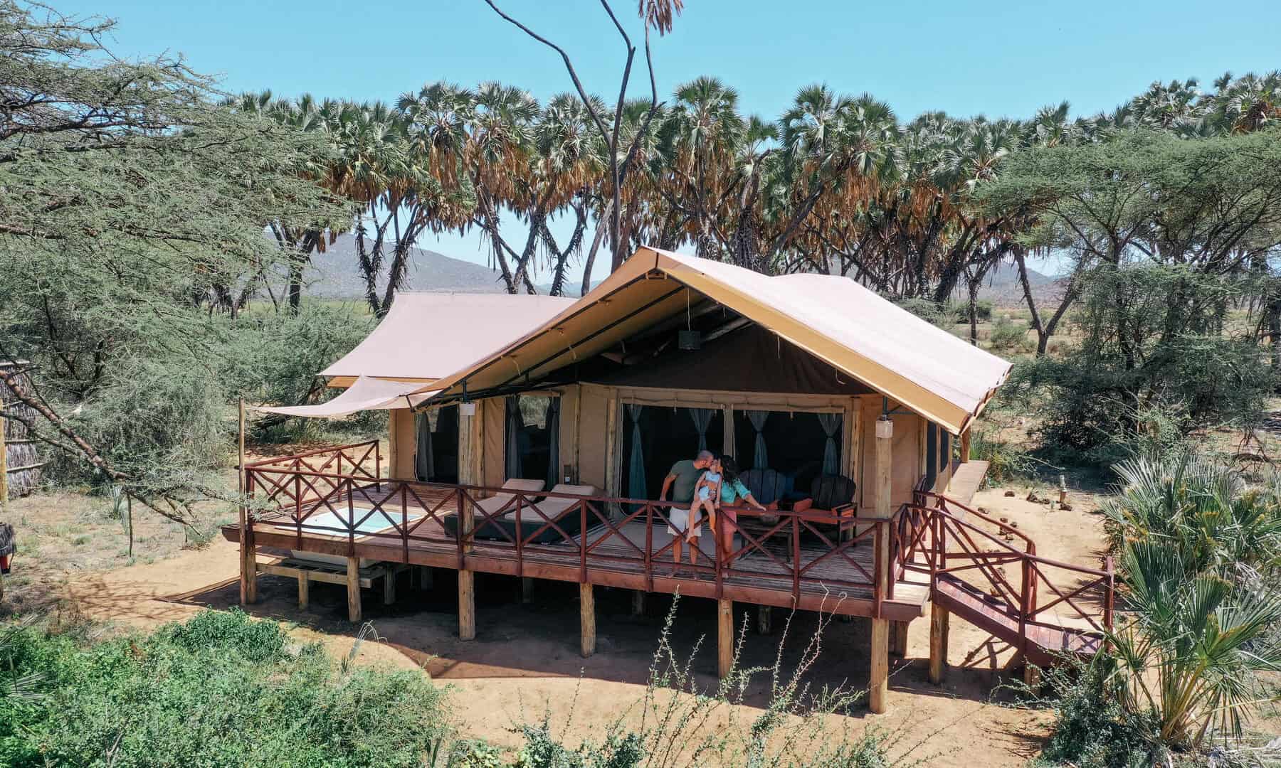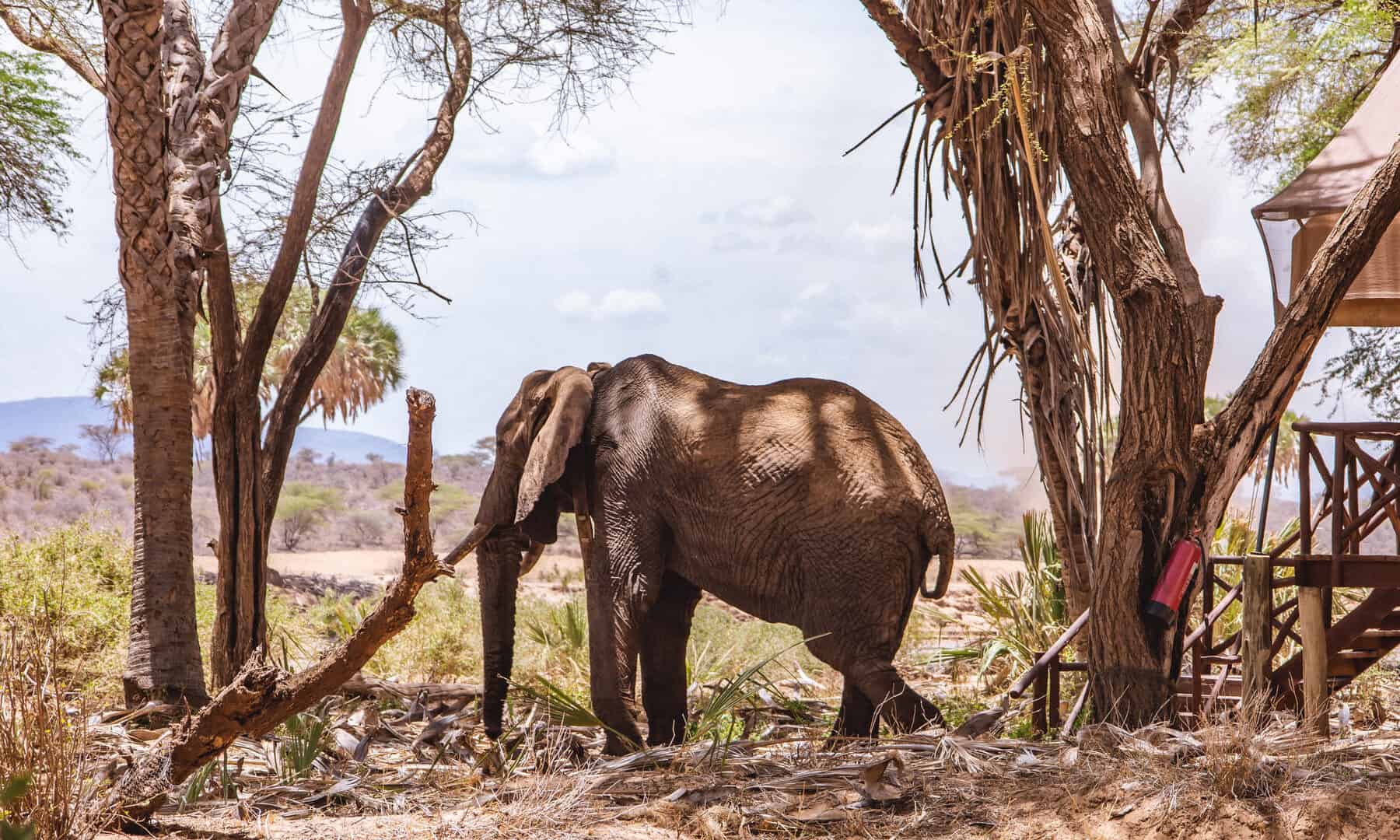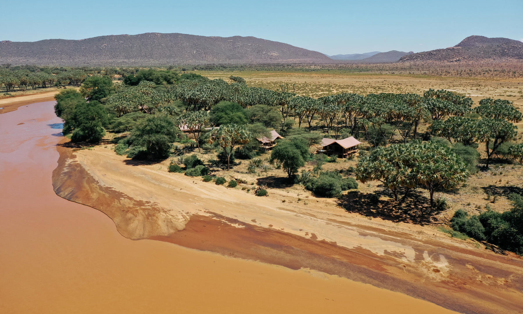 Elephant Bedroom Camp offers luxury in a setting of breath taking beauty. It is set along the banks of the Ewaso Nyiro River and shaded by Doum palms and other trees that make up this green belt of riverine forest in Samburu National Reserve.