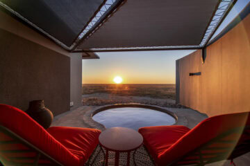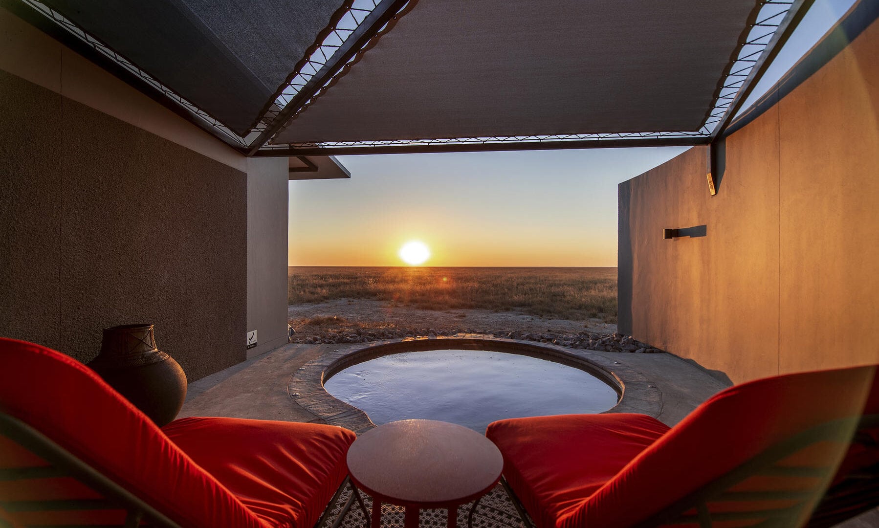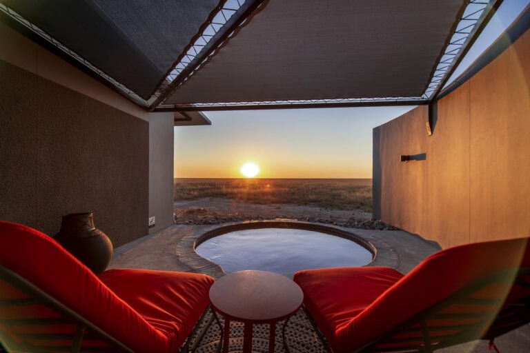 Etosha King Nehale is situated on the Andoni Plains, just one kilometre from Etosha’s northern King Nehale Gate and only 48 kilometres north of Namutoni. At this welcoming lodge each of the 40 spacious chalets has its own plunge pool and views over the plains. The lodge has private access to a remote waterhole in Etosha National Park where the lodge has established its Ontalelo Outpost.
