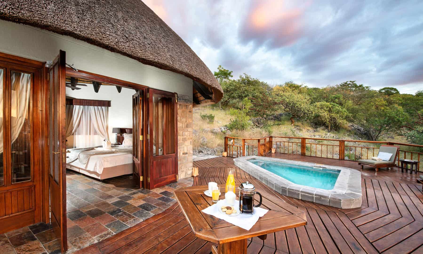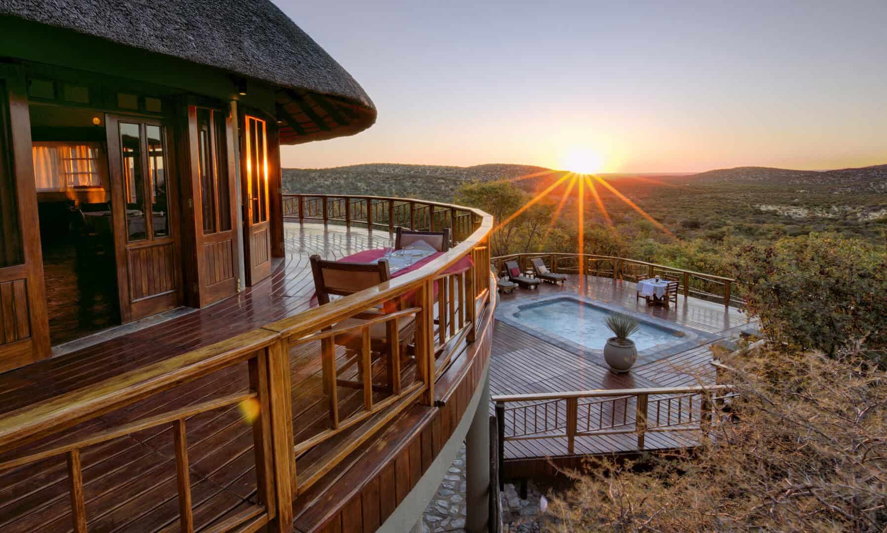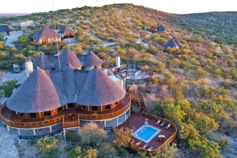 Etosha Mountain Lodge, set in its own Reserve, is designed in the typically Namibian style with beautiful far-reaching views from the dolomite hill on which it stands. The design is characterised by wood and stone interiors with relaxed soft furnishings. Its high roofed, round thatch buildings boast a large ‘Lapa’ area with a well-stocked bar, a lounge with DSTV and in-door fire-place for those chilly winter evenings, a small but plentiful curio shop, reception with Wi-Fi access and lastly the comfortable, spacious dining room. Outside on the large wooden decked area is a refreshing swimming pool, out-door ‘Boma’ and abundant wine cellar.