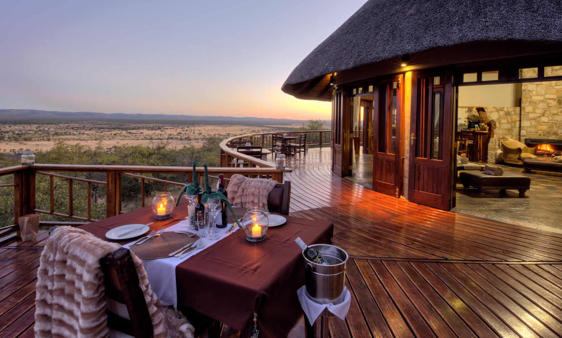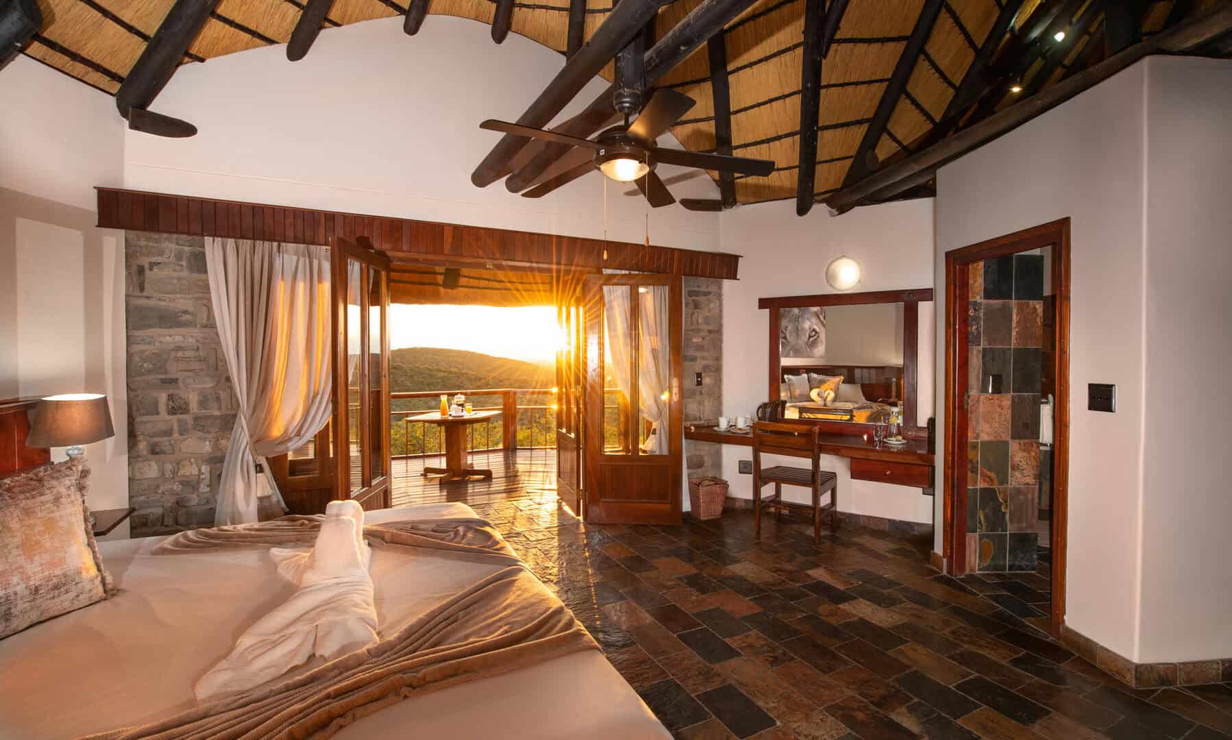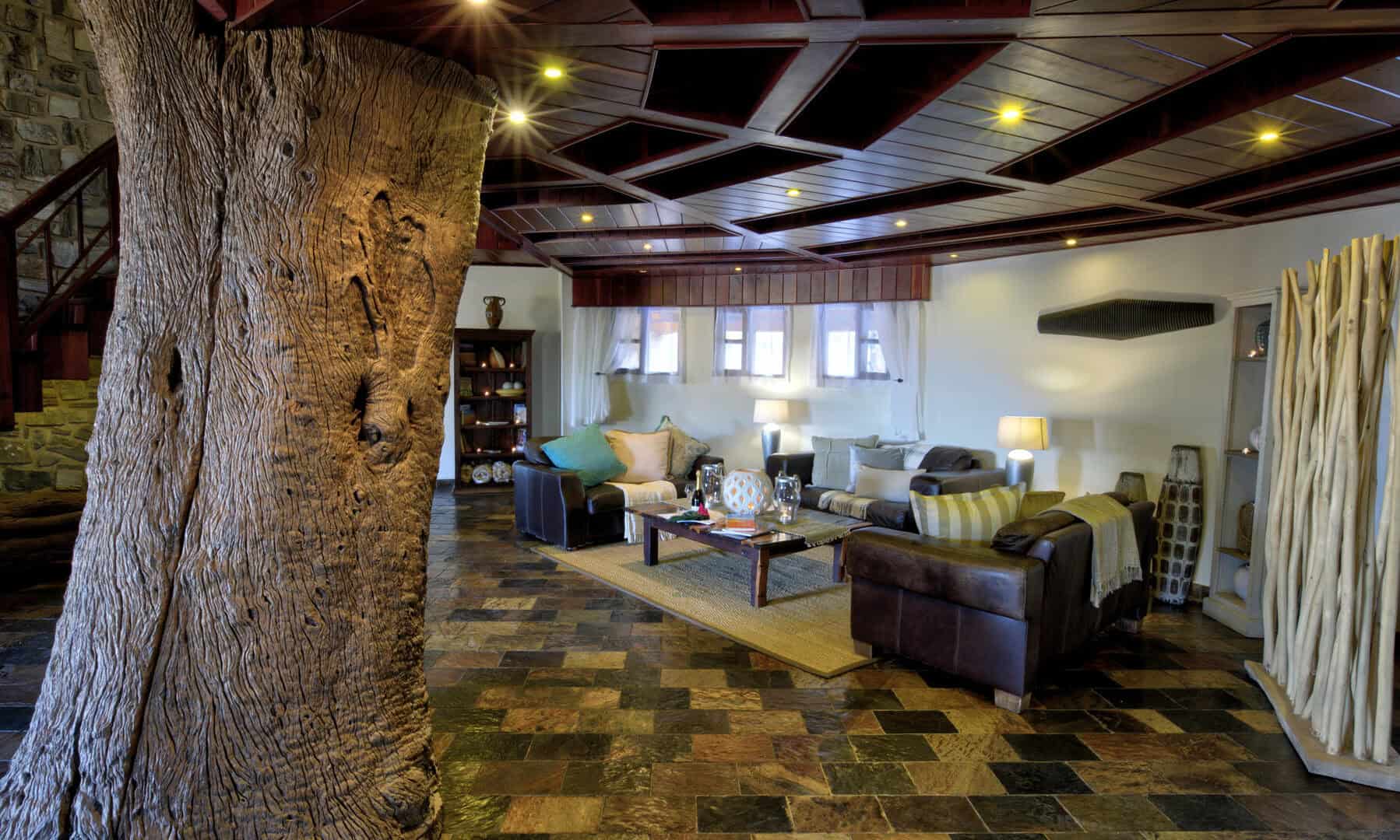 Etosha Mountain Lodge, set in its own Reserve, is designed in the typically Namibian style with beautiful far-reaching views from the dolomite hill on which it stands. The design is characterised by wood and stone interiors with relaxed soft furnishings. Its high roofed, round thatch buildings boast a large ‘Lapa’ area with a well-stocked bar, a lounge with DSTV and in-door fire-place for those chilly winter evenings, a small but plentiful curio shop, reception with Wi-Fi access and lastly the comfortable, spacious dining room. Outside on the large wooden decked area is a refreshing swimming pool, out-door ‘Boma’ and abundant wine cellar.