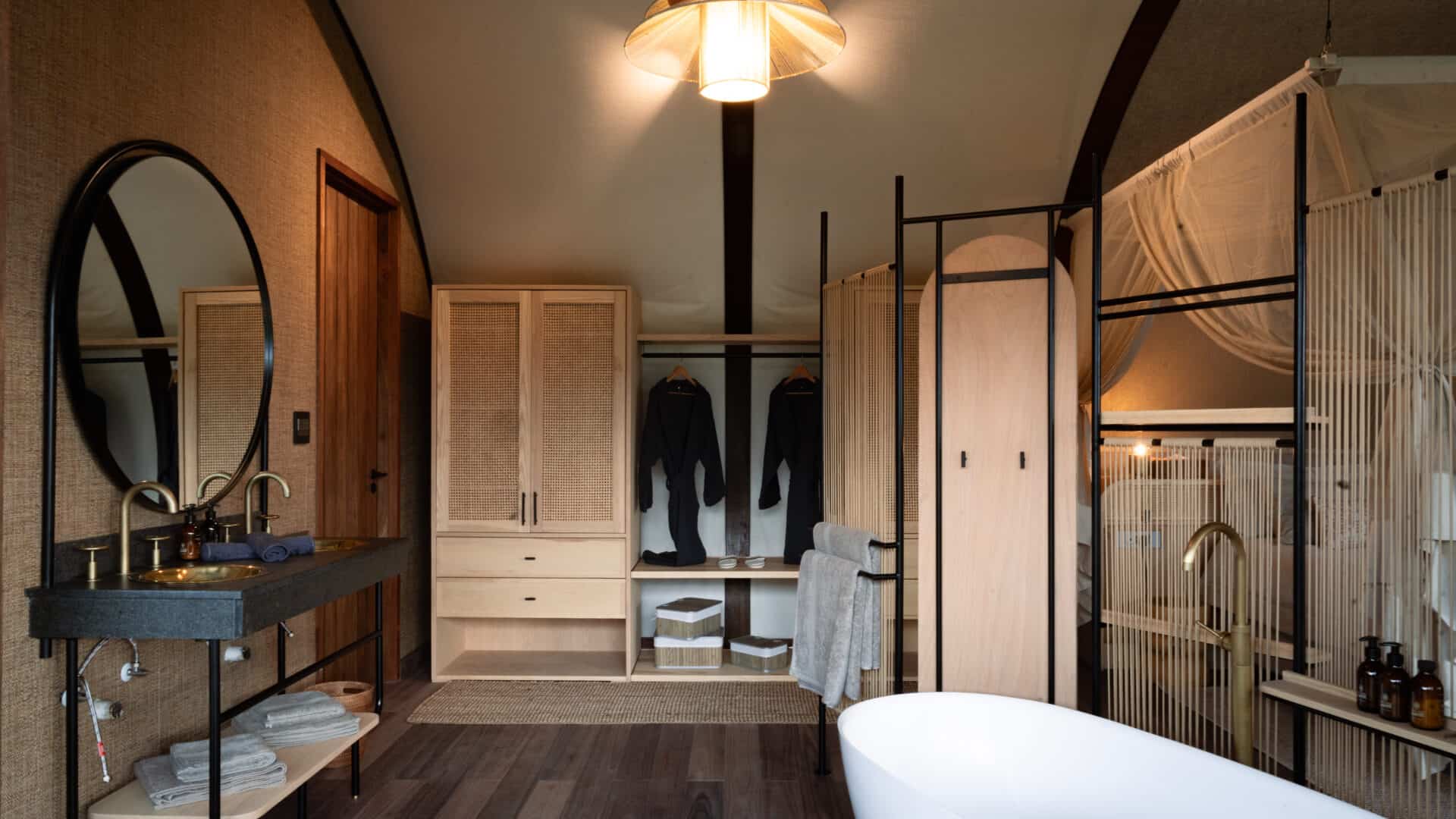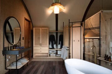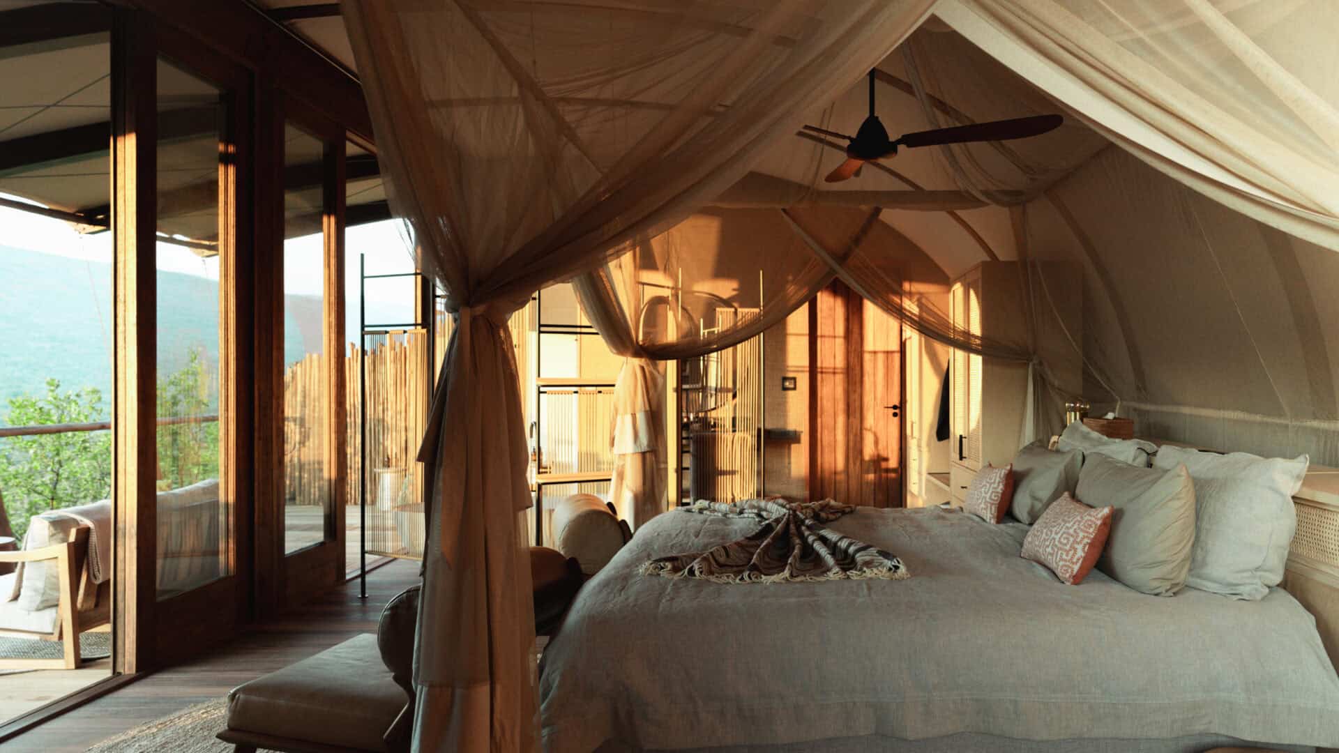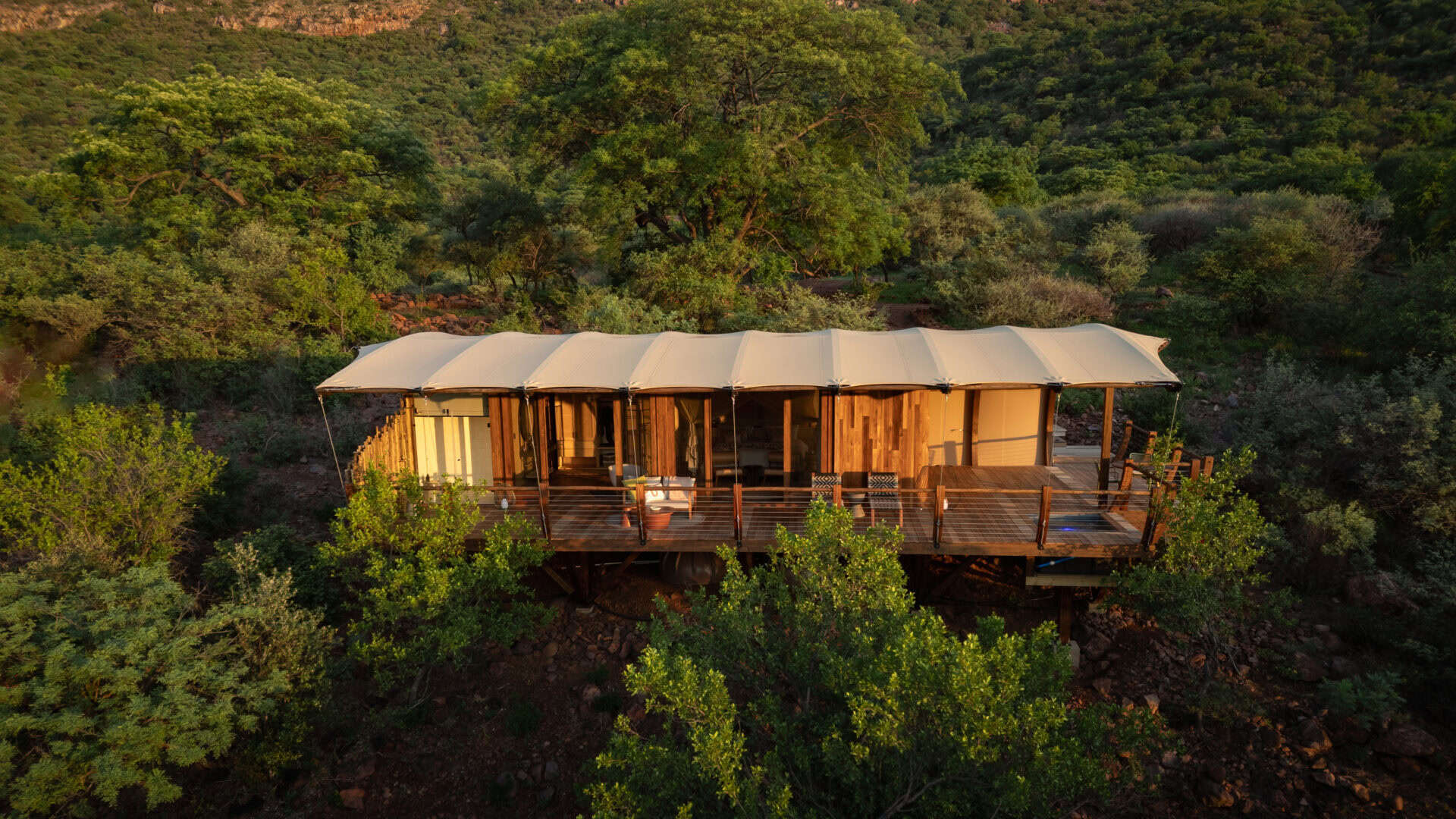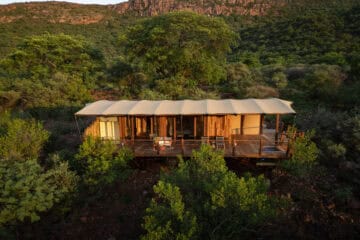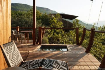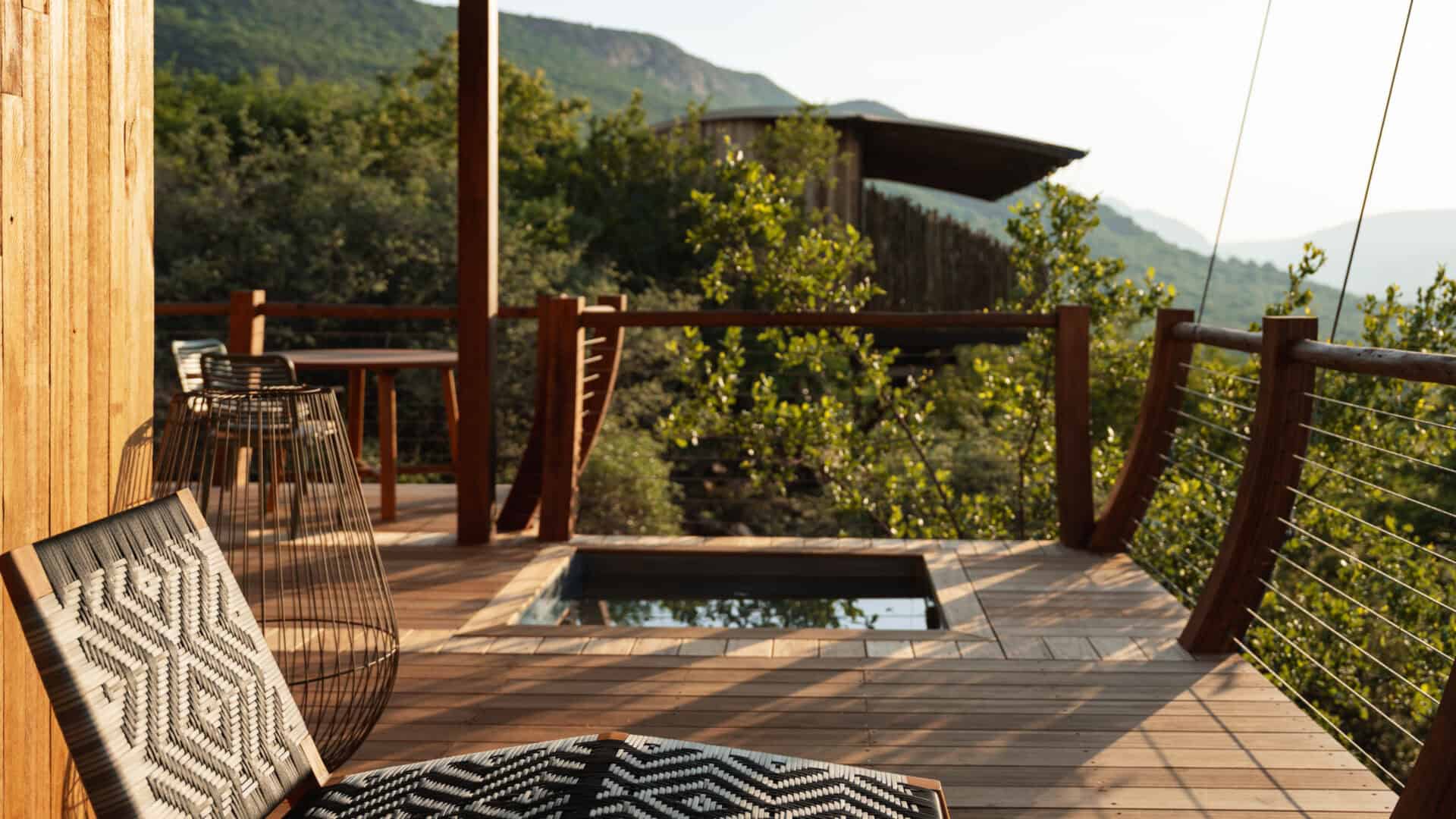 Experience the intimacy of just six luxury private suites in Limpopo, each offering sweeping views of the valley below. Your tented sanctuary features a spacious deck and private plunge pool, creating a secluded haven for relaxation typical of a luxury safari lodge.