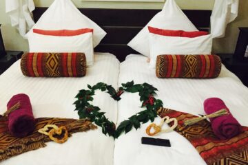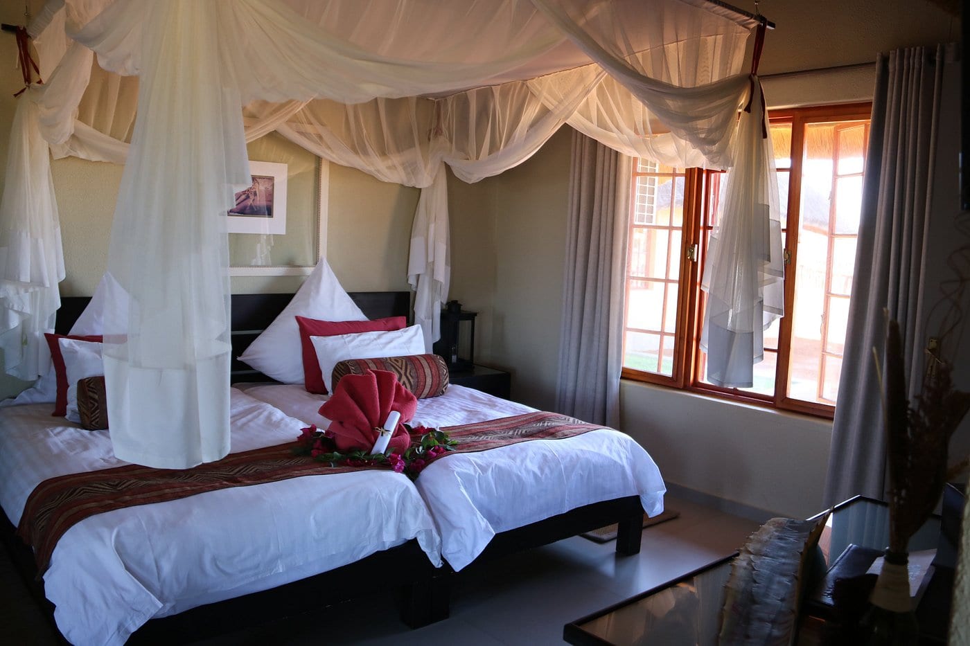 Relax on the sundeck at the swimming pool and watch a succession of Sable Antelope, Black Springbok, and Nyala quench their thirst at the nearby water hole.
