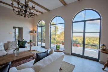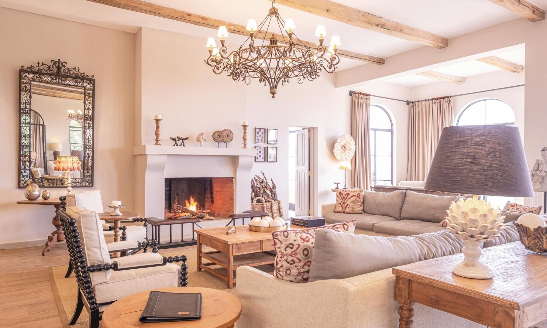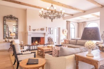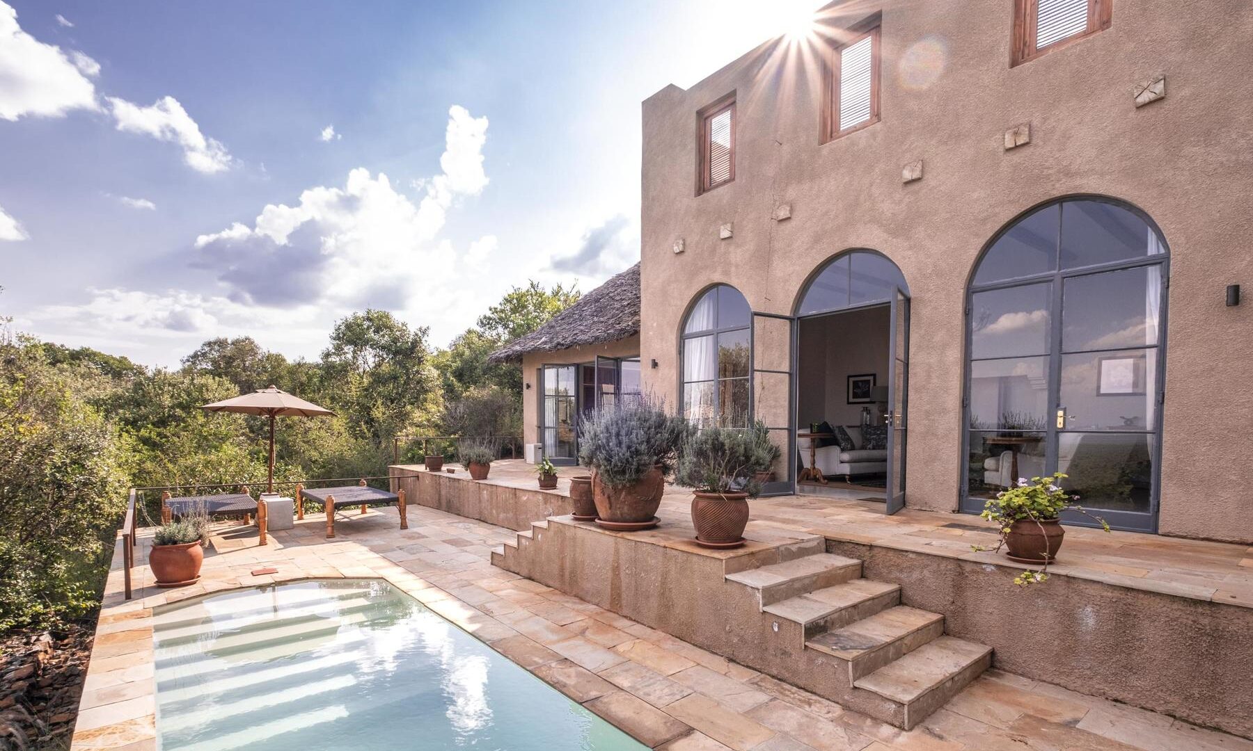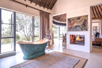 A welcoming main house with open log fires invites you to unwind with sundowners, whereas the infinity pool and poolside spa provide perfect relaxation spots after a day of exploration. At the purpose-built hide below the lodge, observe wildlife visiting the waterhole throughout the day. Your safari experience extends beyond traditional game drives to include e-bike adventures, guided bush walks, canoeing, and even a round of golf at the conservancy’s nine-hole course.