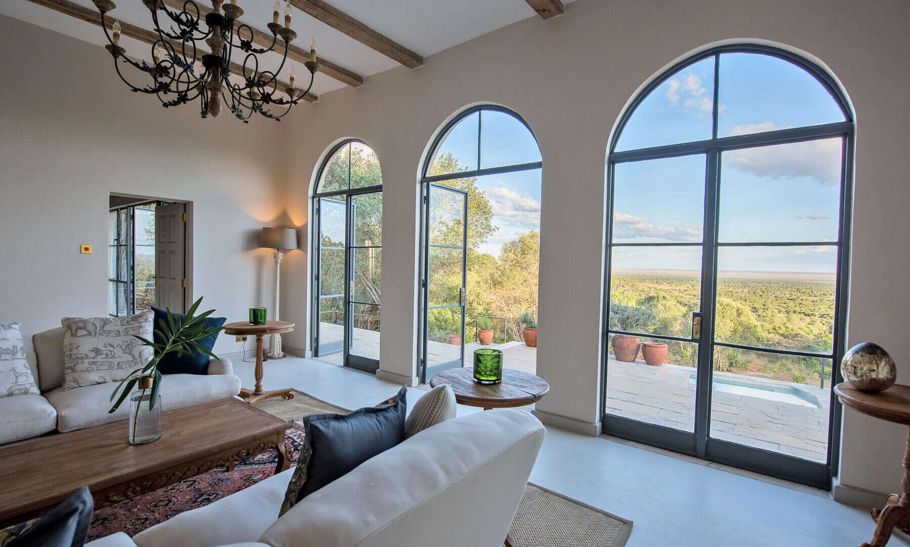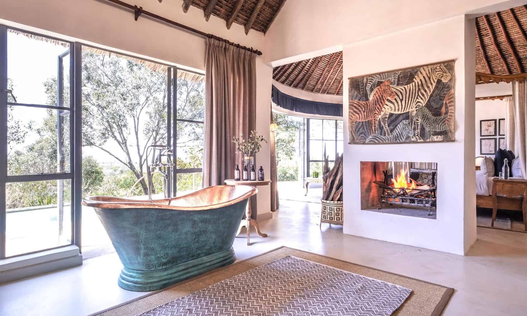 A welcoming main house with open log fires invites you to unwind with sundowners, whereas the infinity pool and poolside spa provide perfect relaxation spots after a day of exploration. At the purpose-built hide below the lodge, observe wildlife visiting the waterhole throughout the day. Your safari experience extends beyond traditional game drives to include e-bike adventures, guided bush walks, canoeing, and even a round of golf at the conservancy’s nine-hole course.