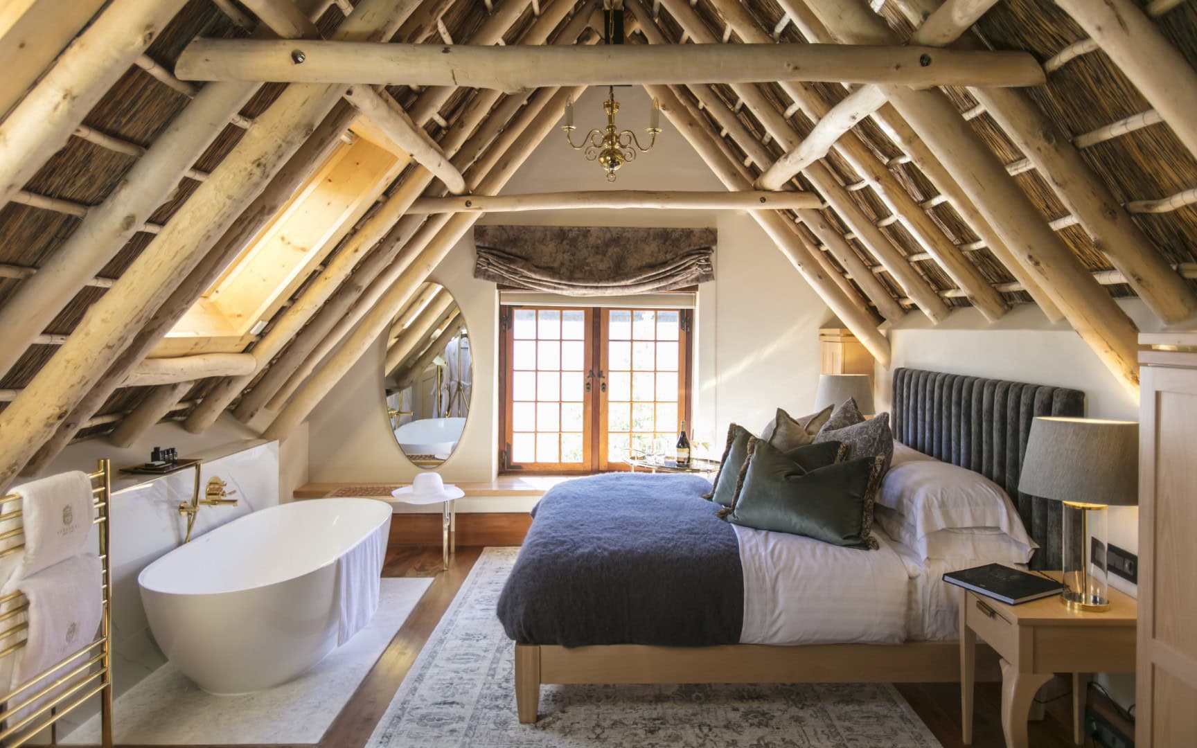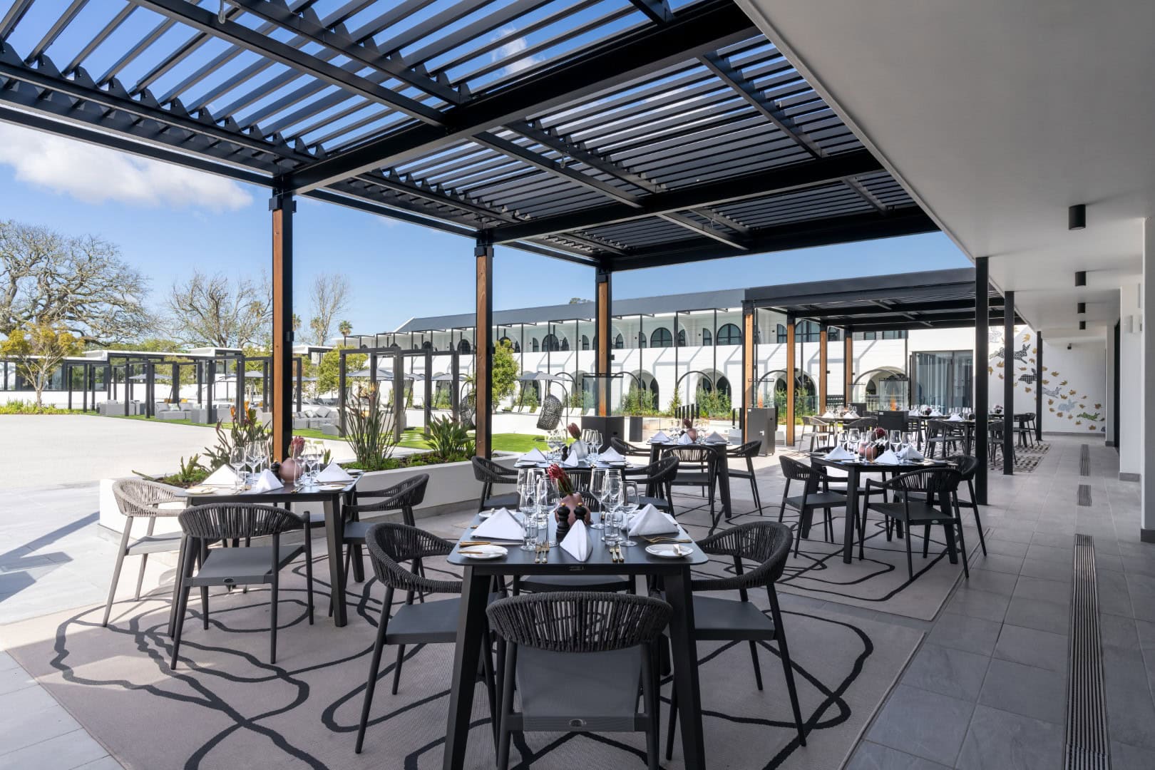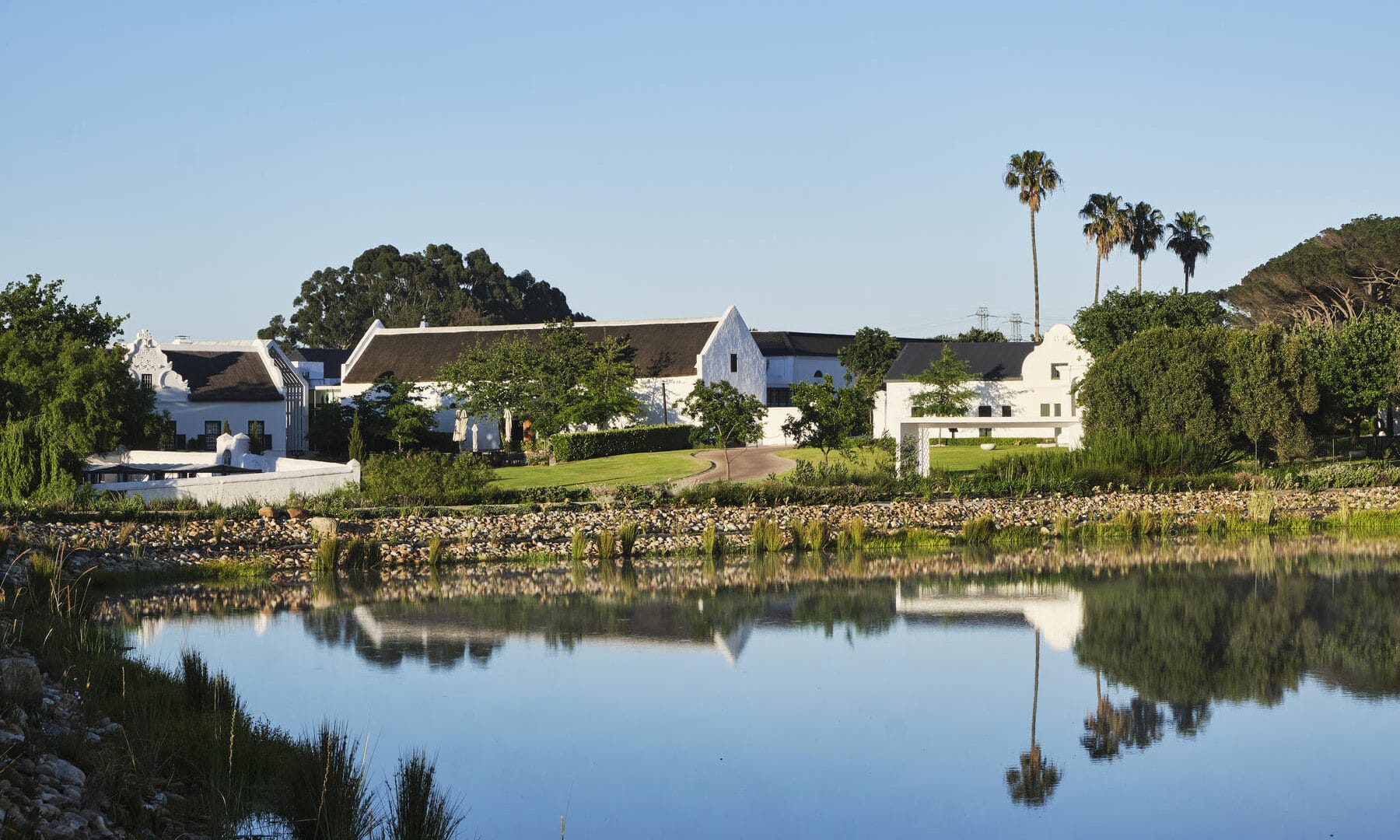 At the gateway to the Cape Winelands, the contemporary, five-star Hazendal Hotel and Spa is framed by rolling vineyards and the Bottelary and Simonsberg mountains in the distance.
