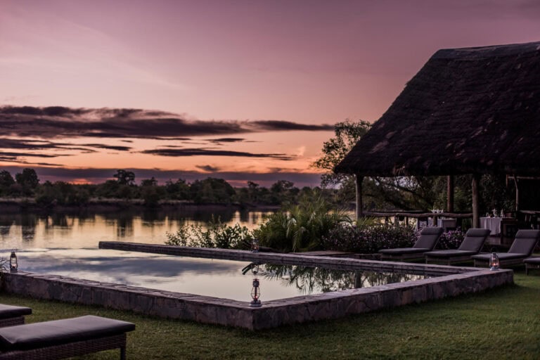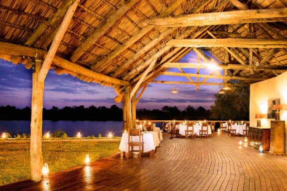 The dining area at Ila Safari Lodge is set in the U-shaped boma on the edge of the Kafue River offering guests a beautiful view at Breakfast, Lunch & Dinner.