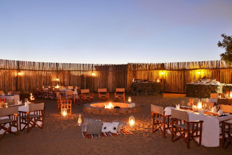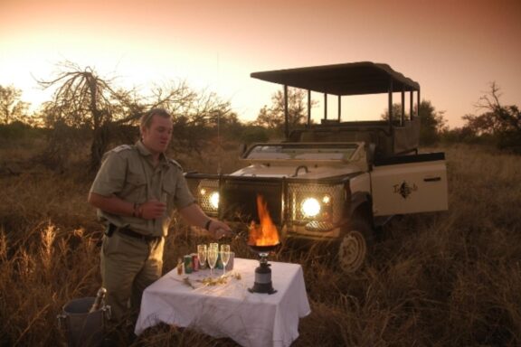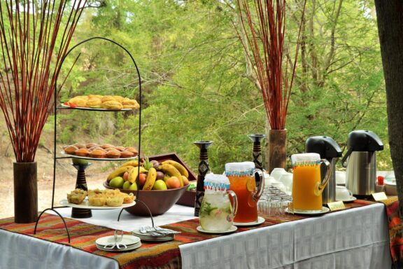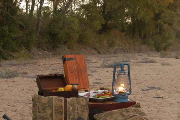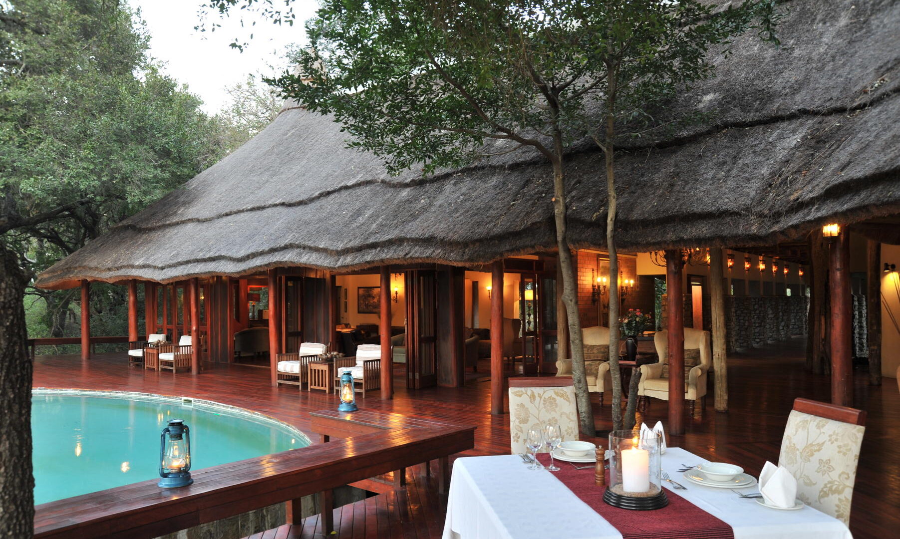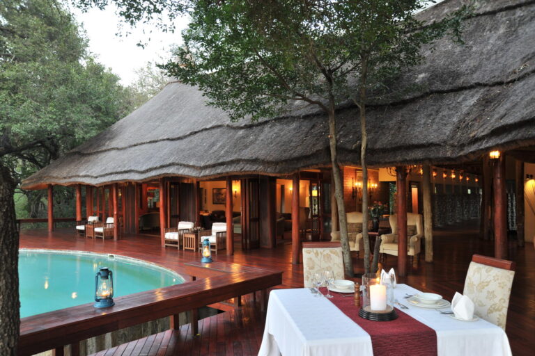 Meals are served in the comfortable dining room where an impressive Jackalberry tree rises through the deck and Tsonga-styled thatched roof. Dinner may be served under the stars while you listen to the enchanting sounds of the surrounding bush coming alive at night.