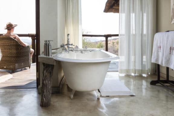 Carved from the hillside, eight glass fronted luxury chalets and one Deluxe Suite line a natural spring, each enjoying striking views of the African Bush.