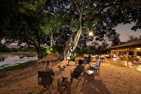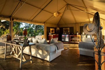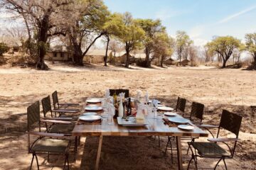 The pan is one of the biggest in the park and is surrounded by a grove of large ebony trees. A magnificent fig and ancient ebony form the canopy of the main lounge and dining area of the camp.
