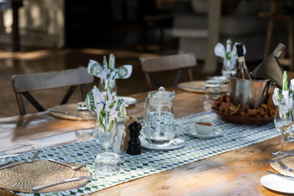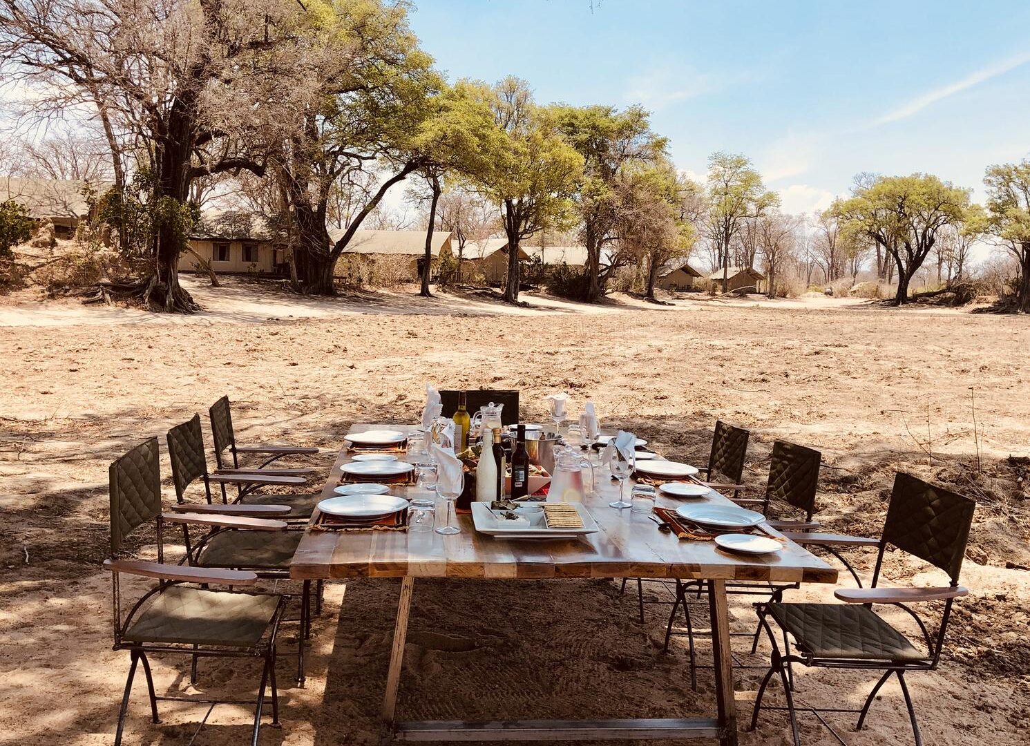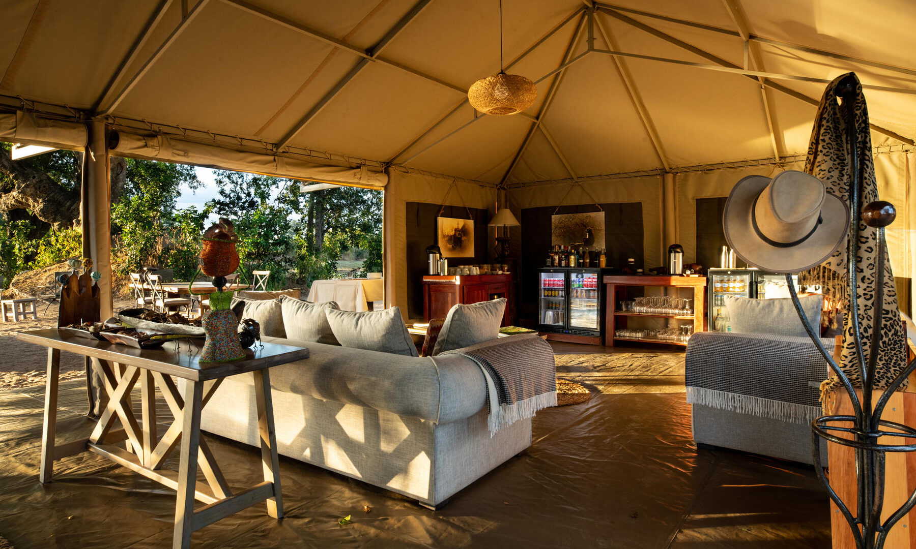 The pan is one of the biggest in the park and is surrounded by a grove of large ebony trees. A magnificent fig and ancient ebony form the canopy of the main lounge and dining area of the camp.