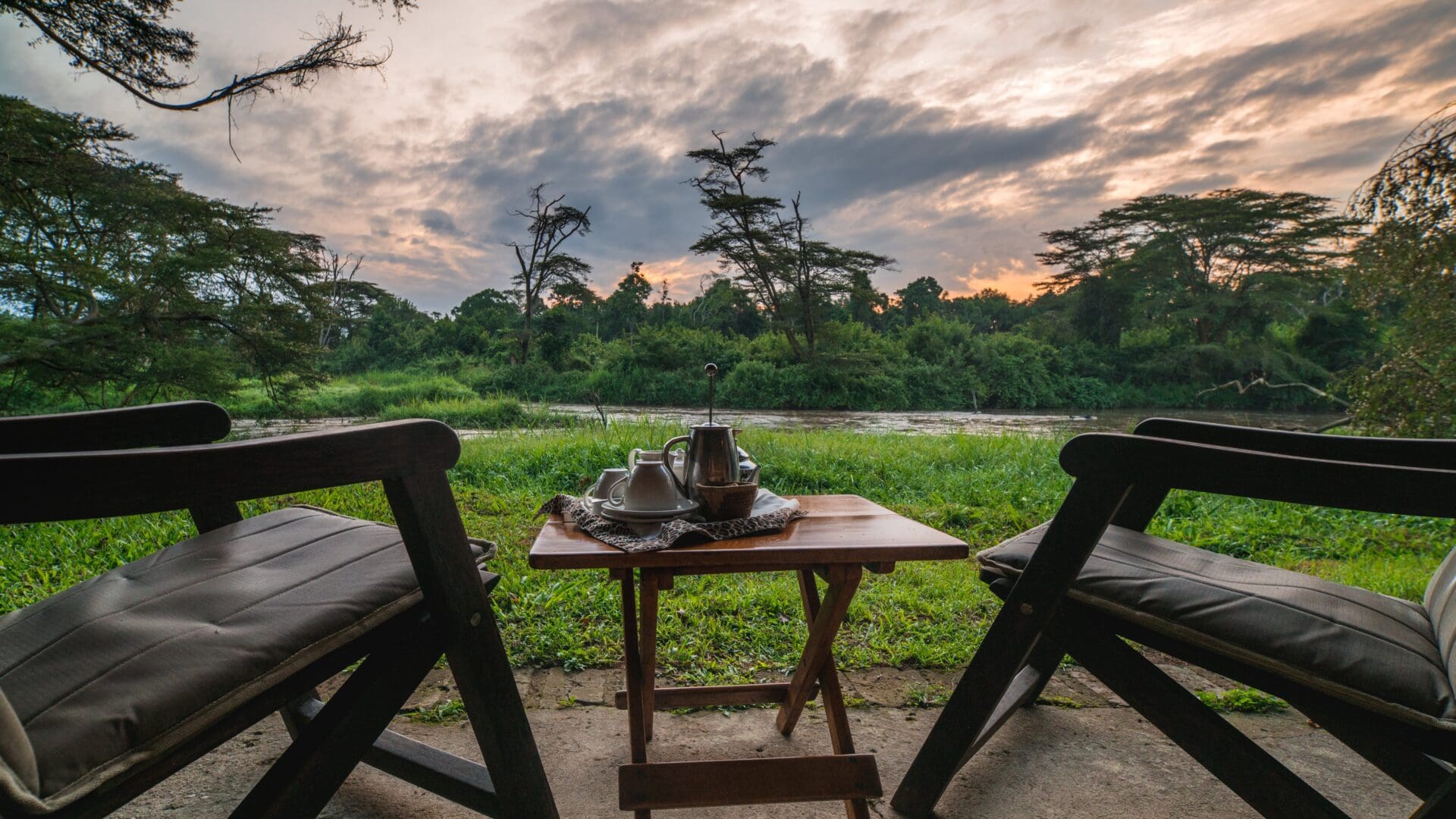 The thatched central lounge and dining area opens out to the river, offering a relaxed setting for meals, while open-air dining and sundowners by the campfire invite you to unwind under the stars. A self-service tea and coffee station is available throughout the day, and you’ll wake each morning to a hot beverage brought to your verandah.