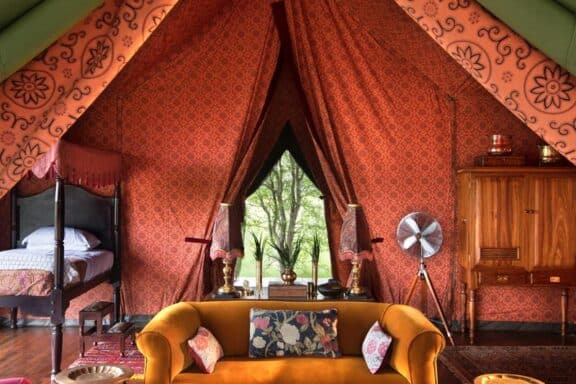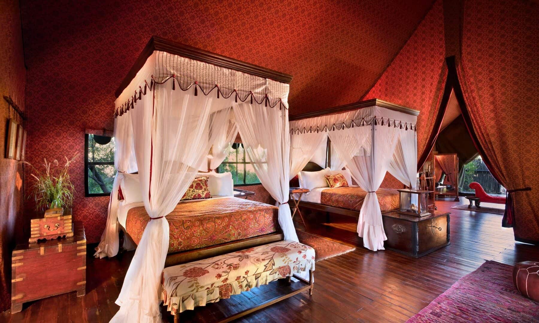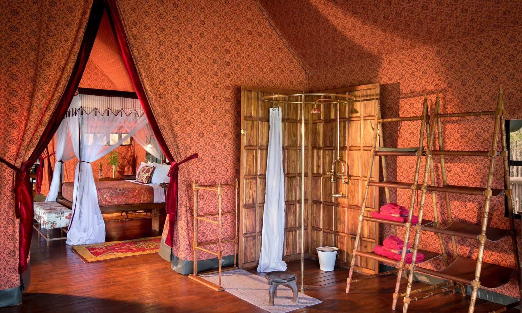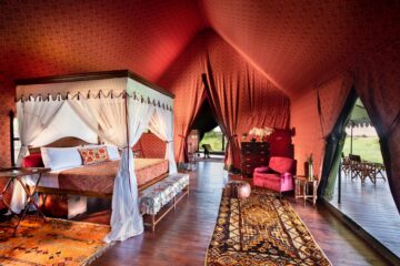 Jack’s Camp, re-opened in 2021, pays homage to the property’s enduring and much-loved 1940s campaign style. The 9 guest tents are about 270 square metres in size, with iconic interiors embellished with rich textiles from around the world, Natural History Museum cabinets, and an overhead bed cooling system. Ensuite bathrooms have both indoor and outdoor showers and outside, each veranda has a private plunge pool.