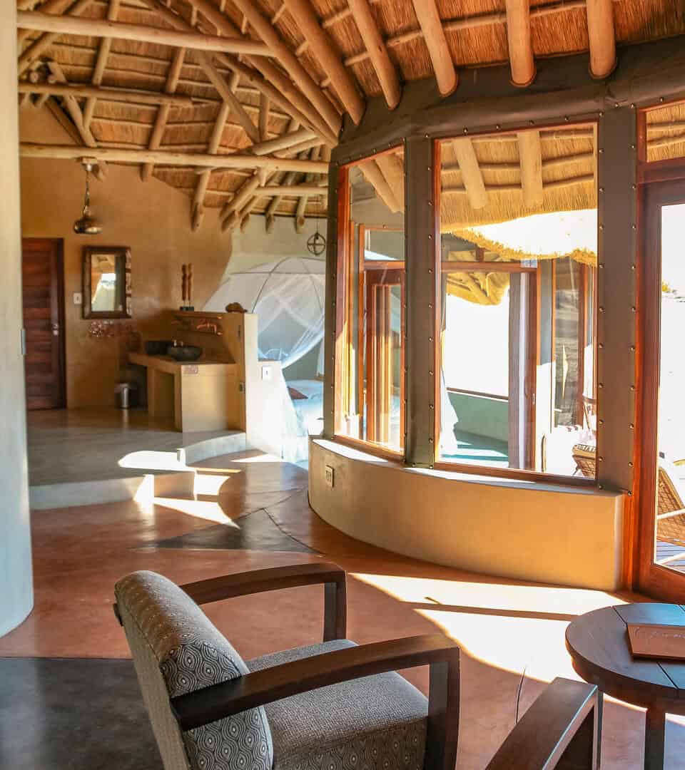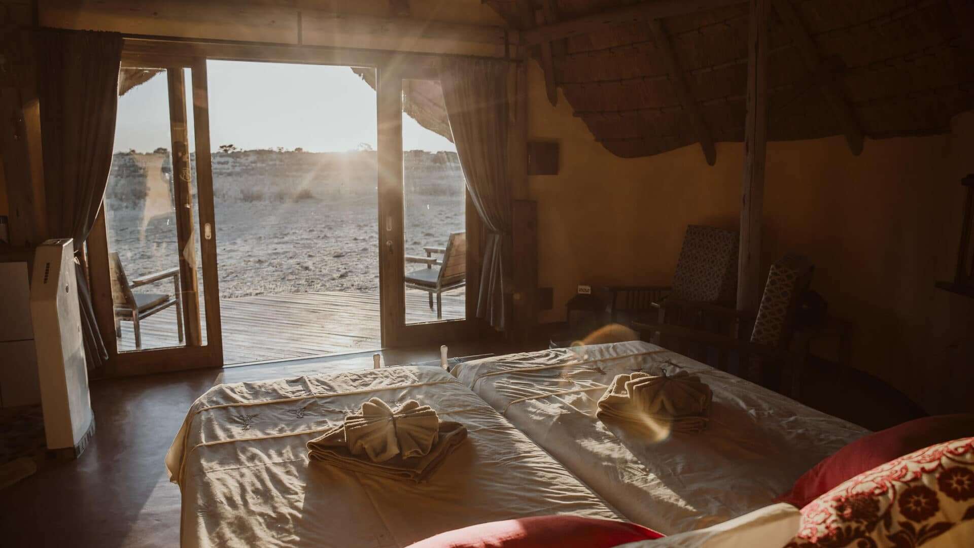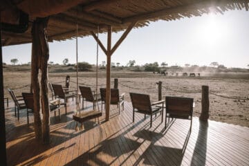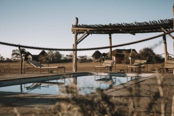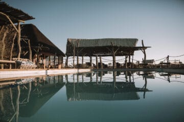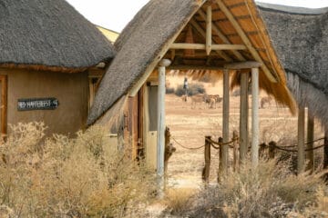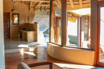 The main house, consisting of reception, lobby, restaurant and bar, pool and shaded deck is situated in a dry lake (vlei). A wooden boardwalk connects the main building with the chalets which are nestled around the ‘vlei’, where often animals can be observed.