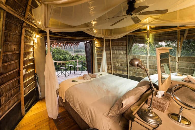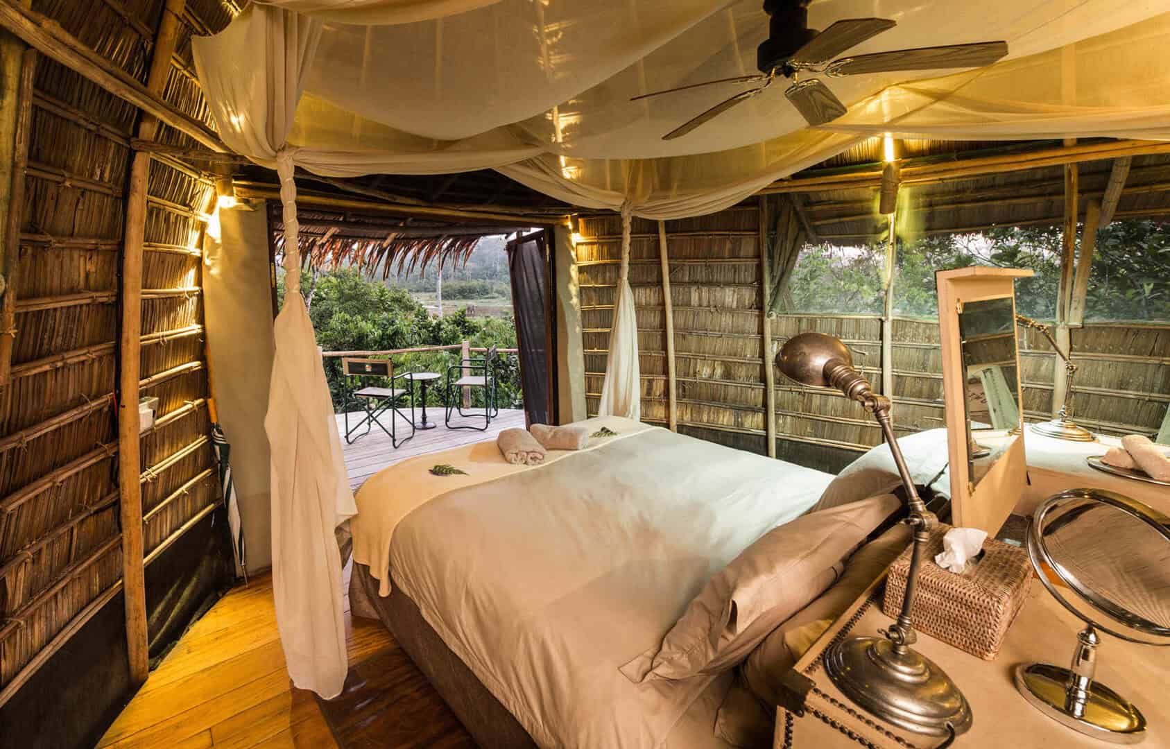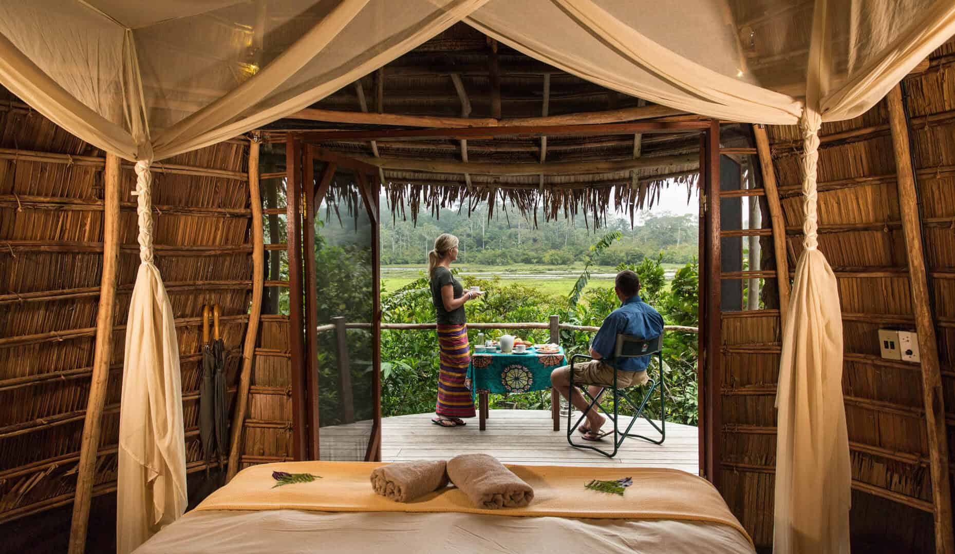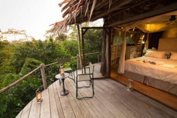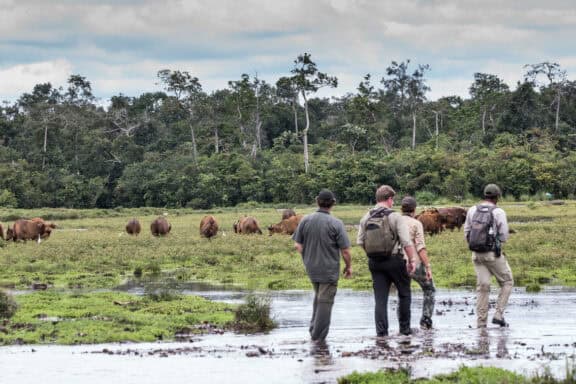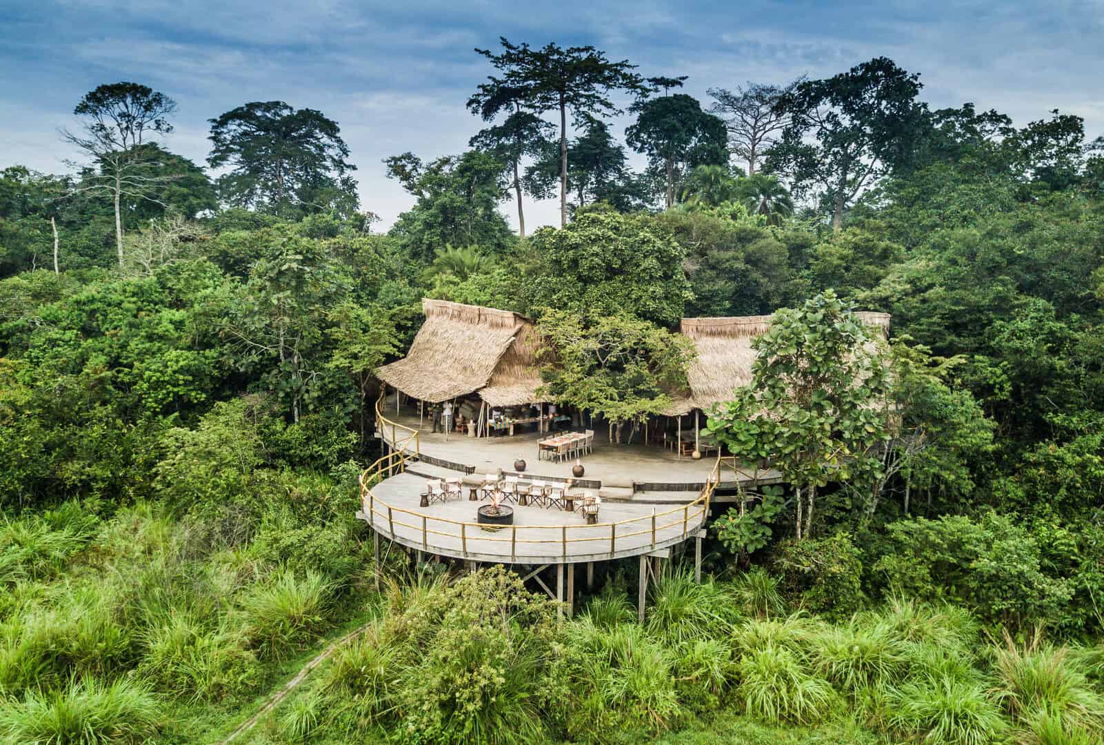 With just six cosy, thatched bungalows perched directly over the baï, Lango Lodge offers an unparalleled front-row seat to this pristine ecosystem. This luxury jungle camp ensures total privacy, warm hospitality, and delicious cuisine, all while you relax in a stylish, open-air pavilion. This conservation-focused eco-camp is committed to sustainable tourism practices, so your Congo safari here is contributing to the preservation of this magical environment.