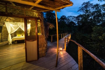 The Ngaga Lodge accommodation consists of just six beautifully hand-built, thatch-roofed bungalows, nestled intimately among the trees. Each one promises absolute privacy and exclusivity, featuring stylish en-suite facilities and wrap-around viewing decks. Fall asleep to the symphony of the Congo basin rainforest – the calls of monkeys, frogs, and insects – a soundtrack unique to the Congo’s heart.