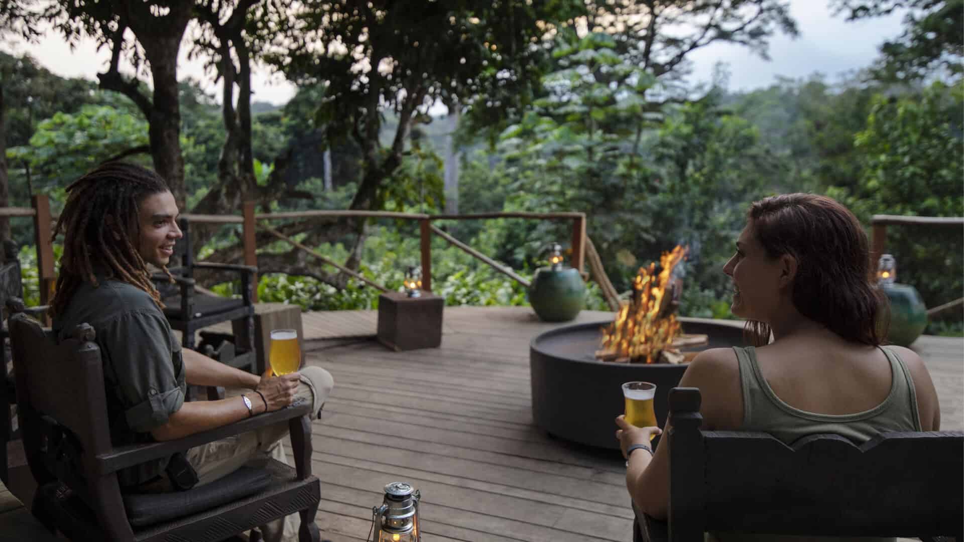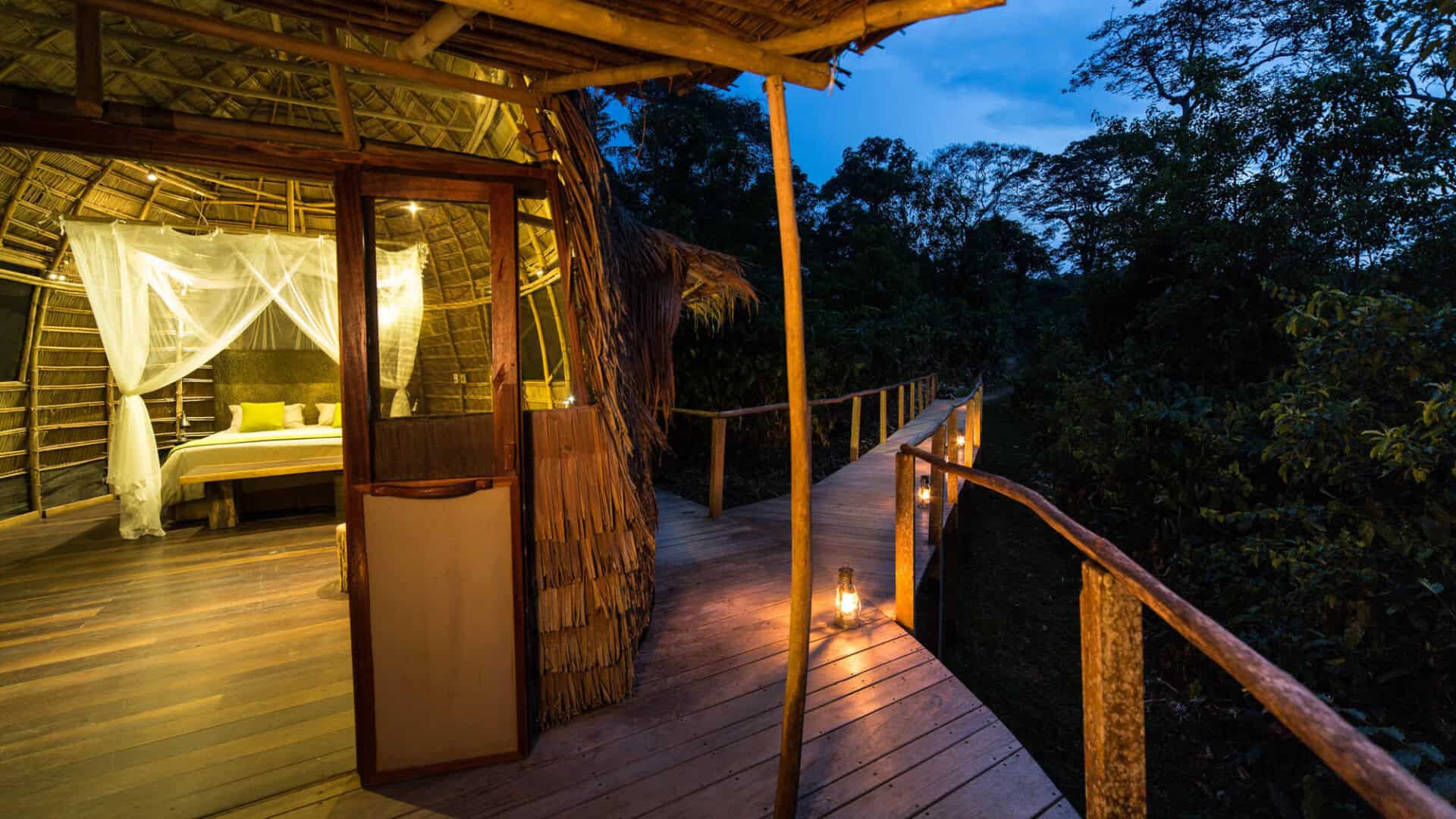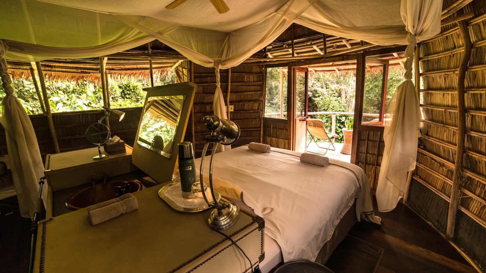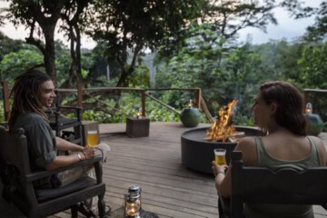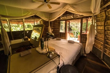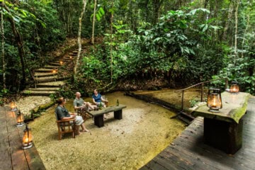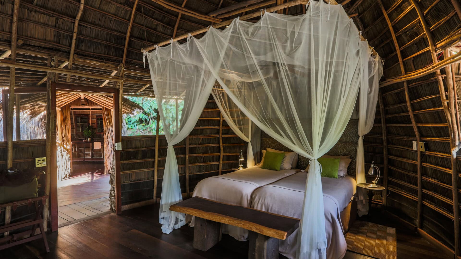 The Ngaga Lodge accommodation consists of just six beautifully hand-built, thatch-roofed bungalows, nestled intimately among the trees. Each one promises absolute privacy and exclusivity, featuring stylish en-suite facilities and wrap-around viewing decks. Fall asleep to the symphony of the Congo basin rainforest – the calls of monkeys, frogs, and insects – a soundtrack unique to the Congo’s heart.