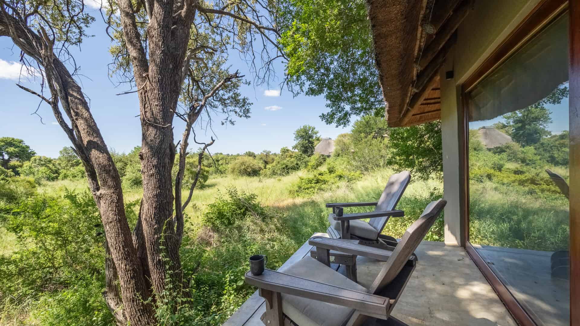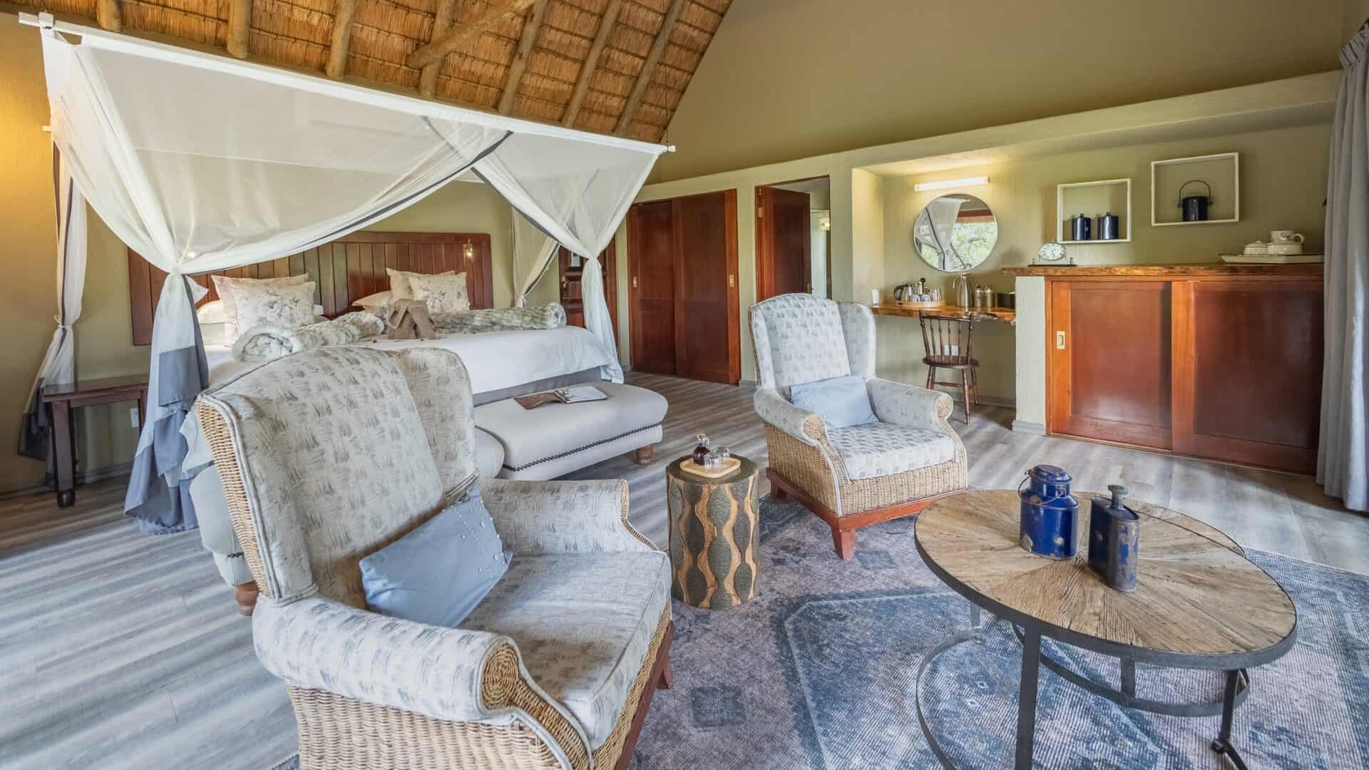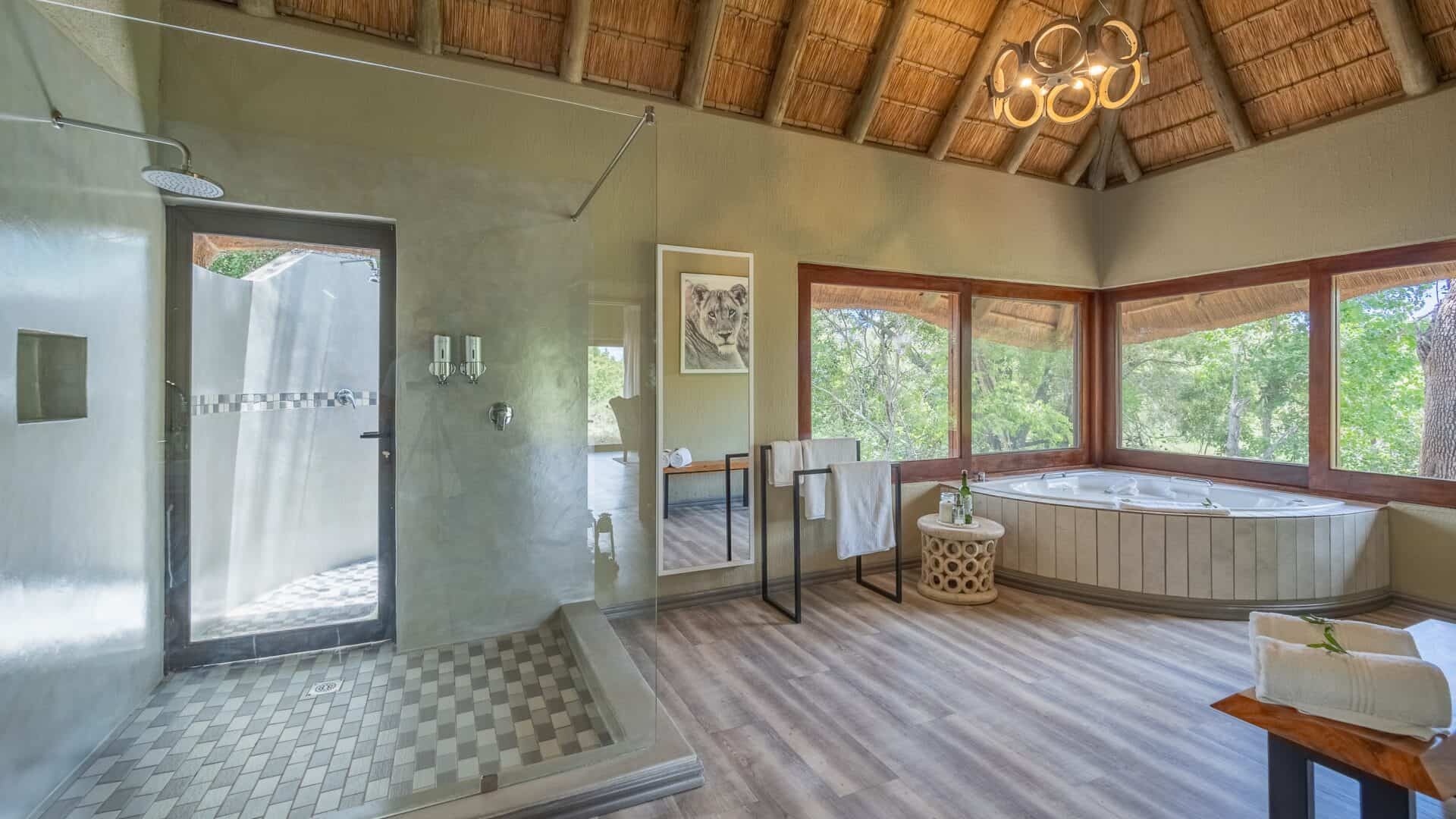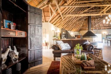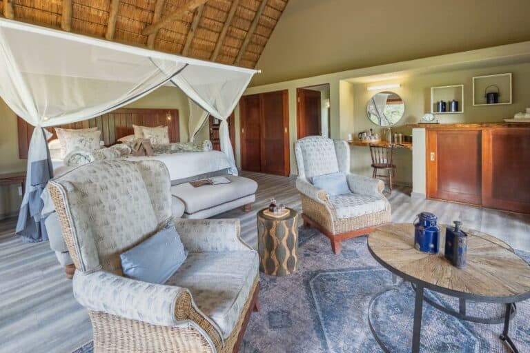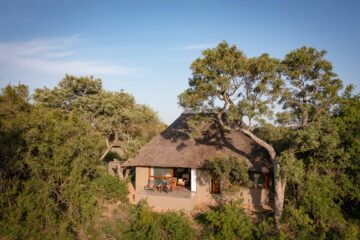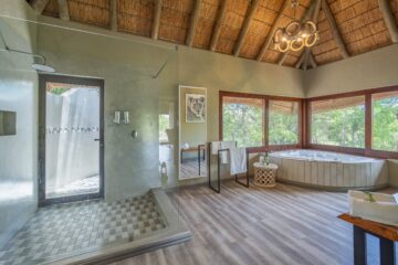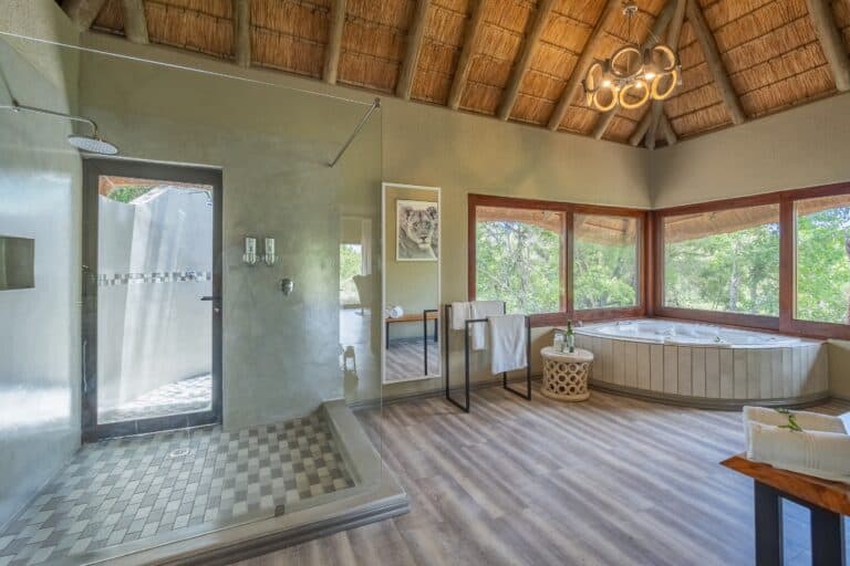 The lodge comprises ten spacious thatched suites, each featuring a private viewing deck, an en-suite bathroom with a spa bath and outdoor shower, and a comfortable lounge area. The design incorporates glass walls to blend indoor and outdoor living, allowing you to enjoy panoramic views of the surrounding bushveld.