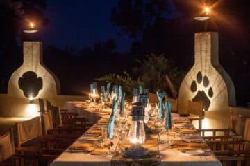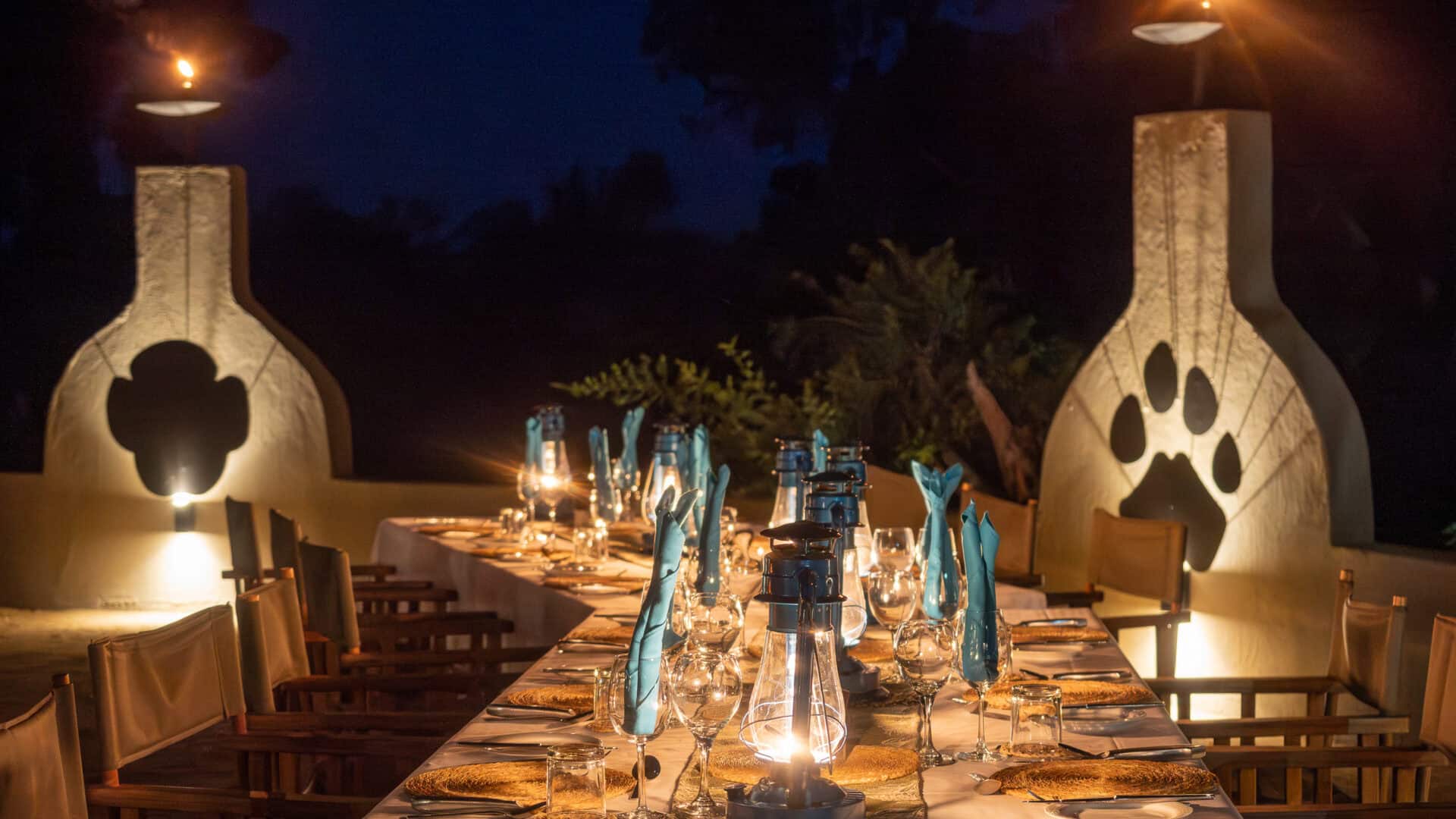 The main lodge area includes a lounge with two large open fireplaces, a bar, and a well-stocked wine cellar. You can dine alfresco or beside the riverbed, surrounded by campfires. The lodge also features two outdoor swimming pools, a spa and wellness centre, a gym, and a library, ensuring a blend of relaxation and adventure.