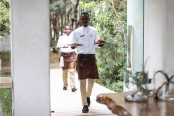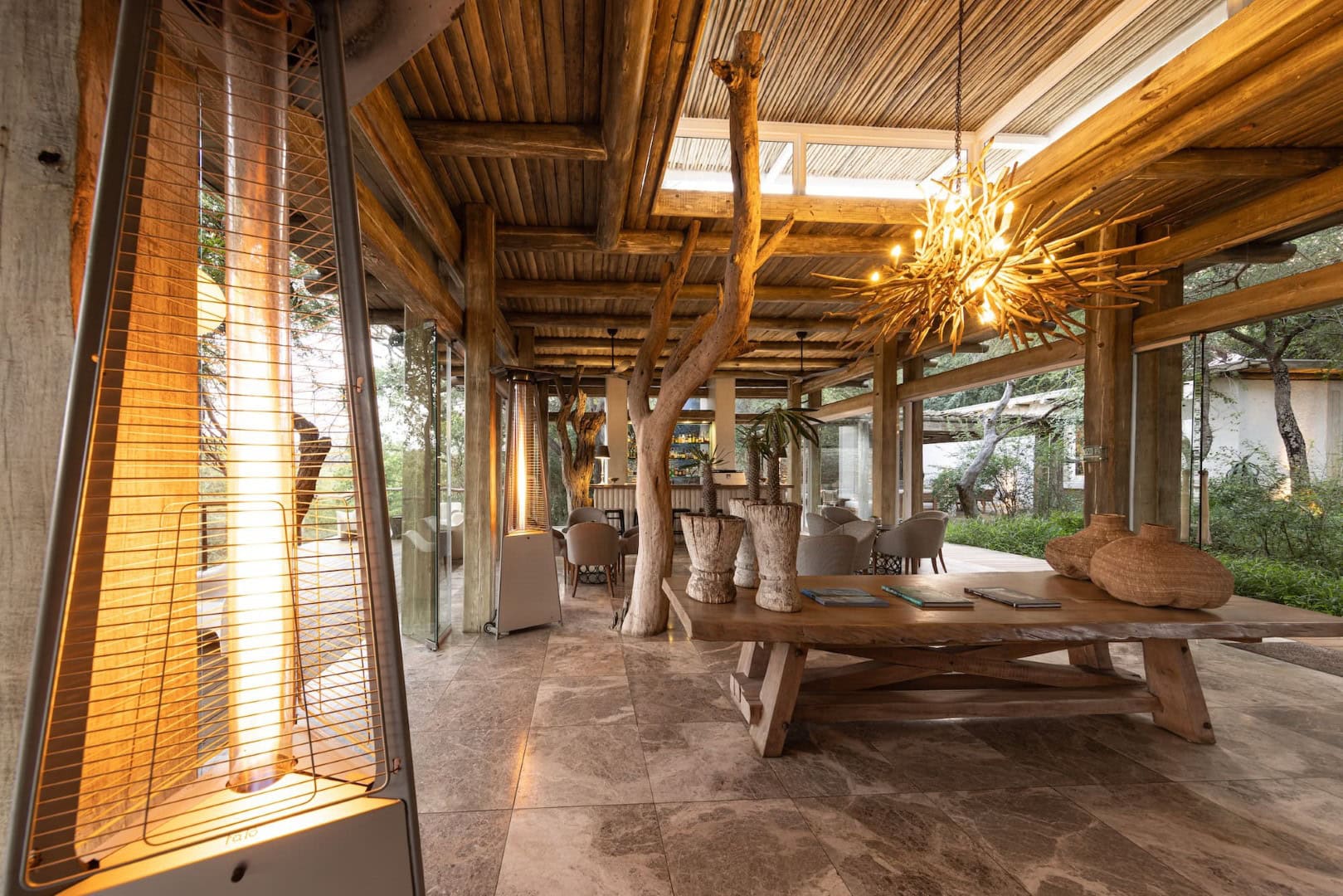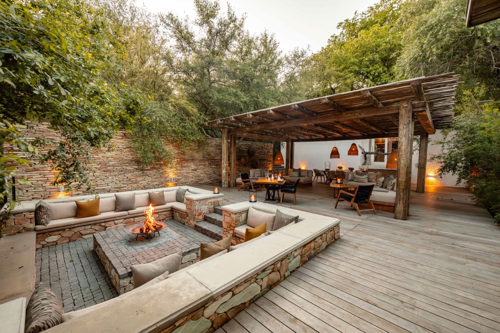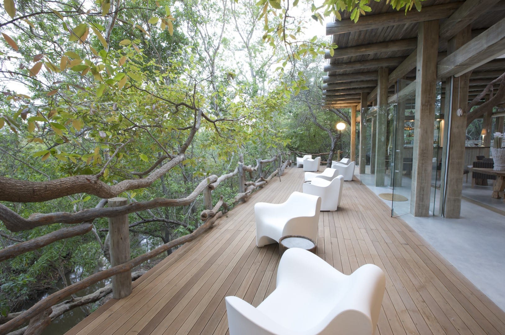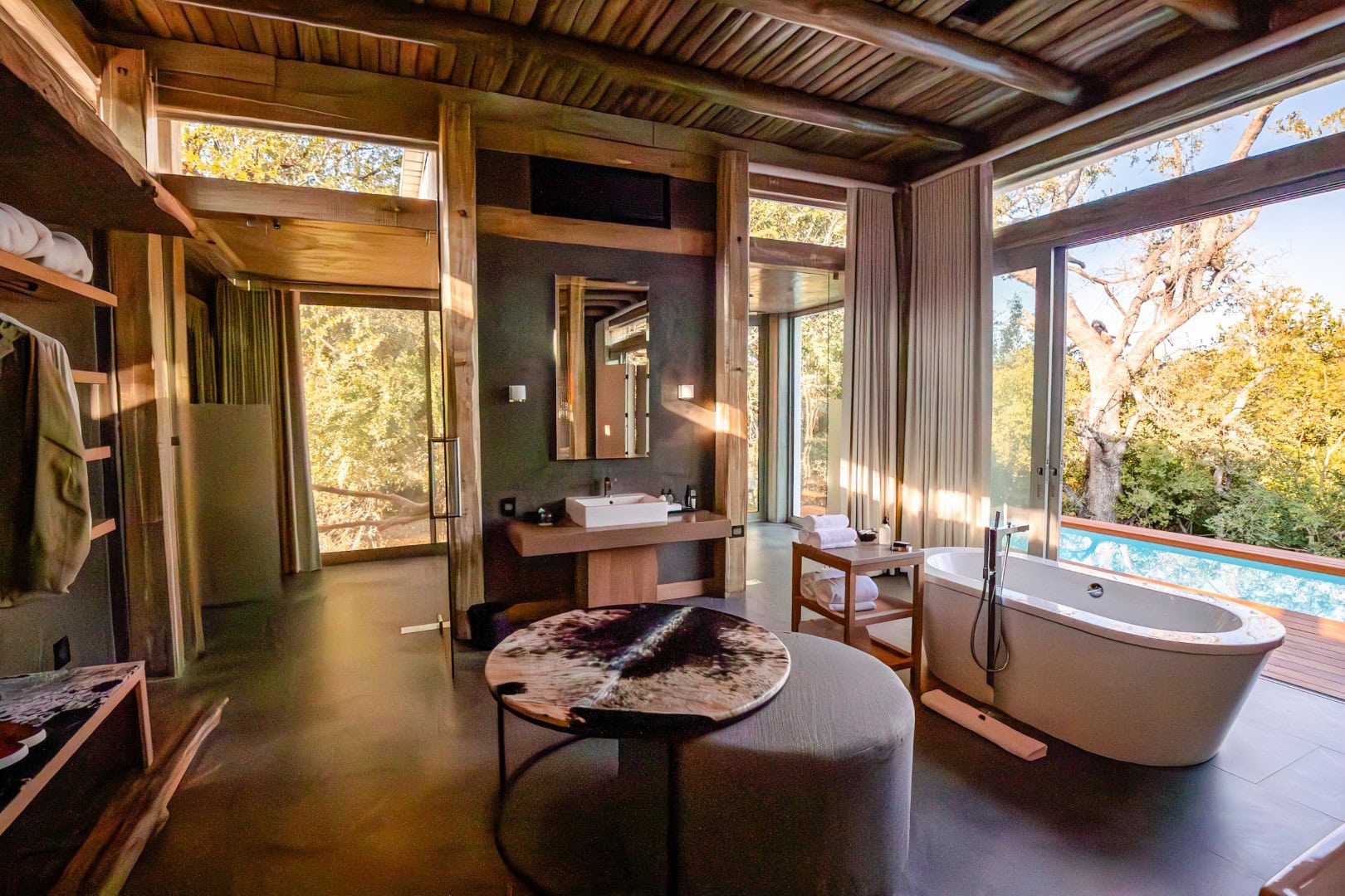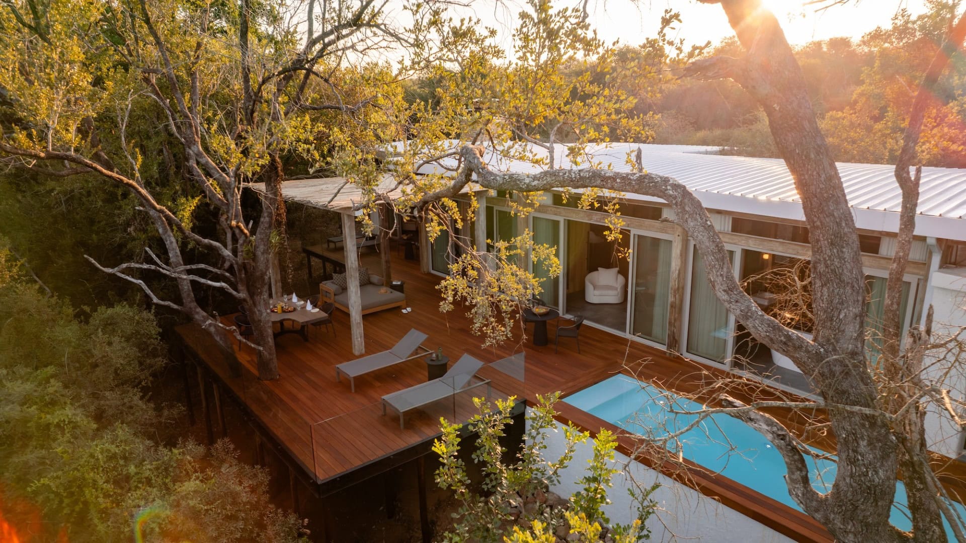 The suites measure on average 100m² each, with a lavish en-suite bathroom, featuring indoor and outdoor showers, his and hers basins and a large designer bath. The suites are wrapped by glistening glass sliding doors opening onto a private outside deck area with a full-size heated swimming pool and sun loungers for relaxation, enabling seamless views over the Klaserie River while spotting wildlife in the Game Reserve.