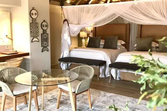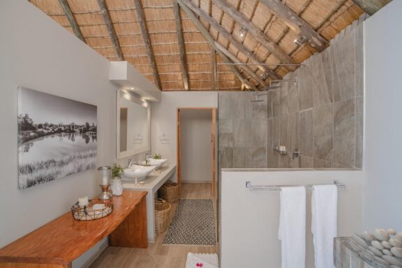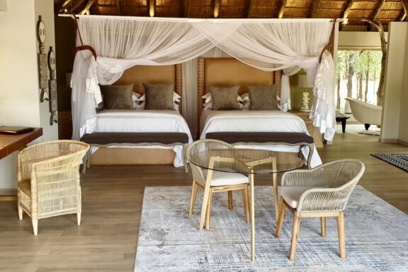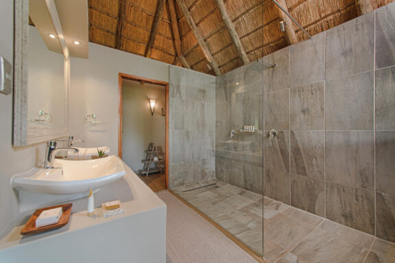The spacious lounge leads onto a vast deck allowing for endless opportunity to view elephant and grazing antelope, or spend the afternoon relaxing beside the pool before being whisked away on a late afternoon safari in an open game drive vehicle, traversing over the 9000 hectares of supreme African bushveld, tracking the Big Five.