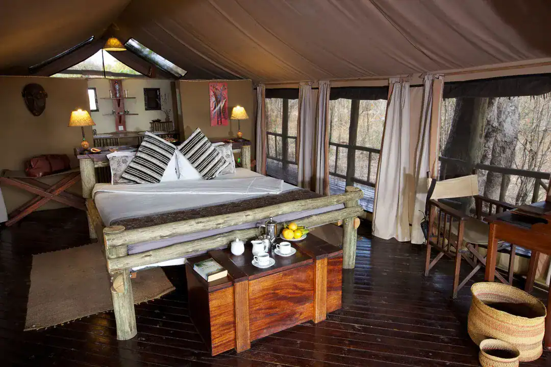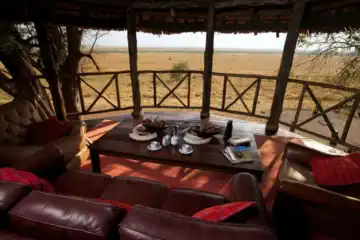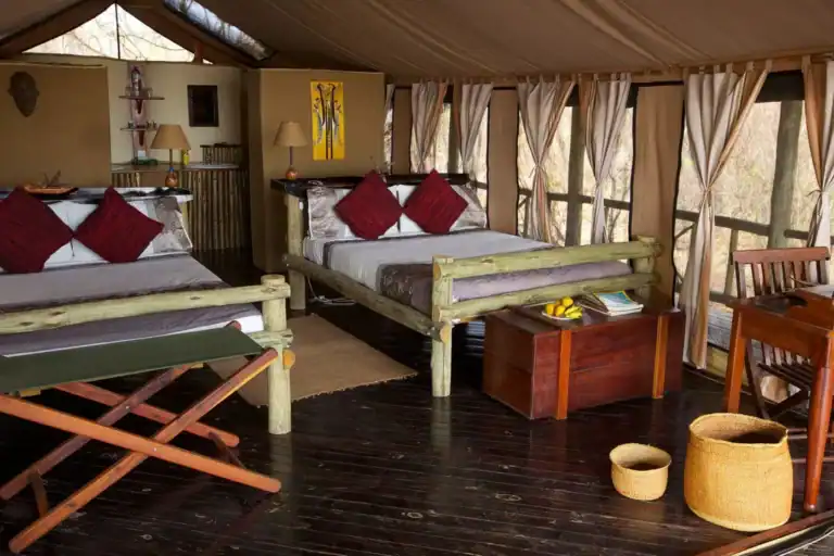 You will settle into one of the six Meru-style tents, offering a comfortable sanctuary from the rugged landscape outside. Each spacious canvas suite provides a spectacular view, allowing you to watch the plains game right from your private veranda. The two-storey main lodge, overlooking the flood plain, acts as the camp’s welcoming social heart for dining and relaxation.